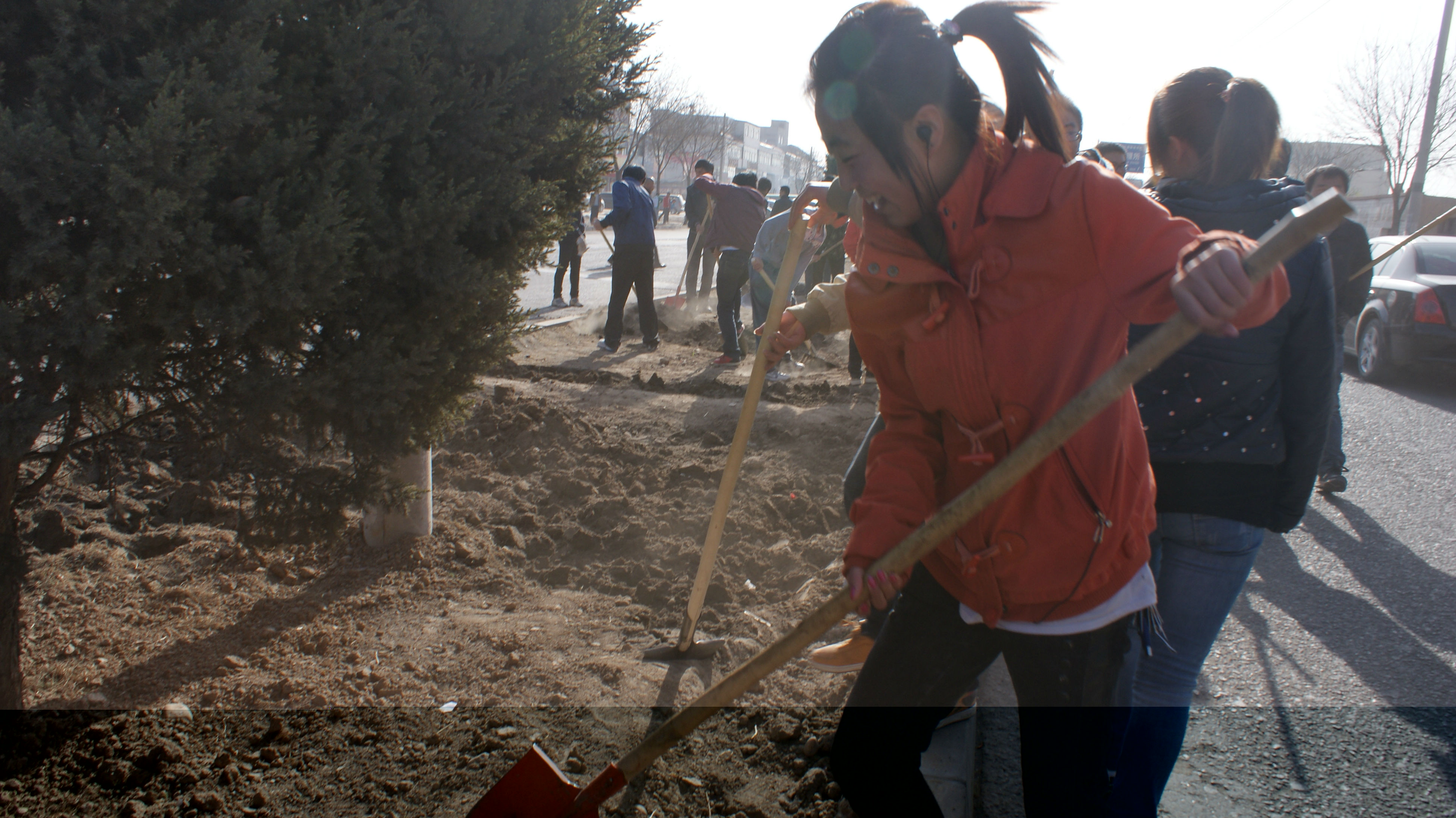 大家早早的來到了目的地,很快投入了植樹和凈化街道的隊伍中。同學們井然有序,手持鐵鍬,一鍬一鍬的鏟土,一片一片的清理大街,干勁十足。同學們無一不閃爍著汗珠,露出幸福的笑容。