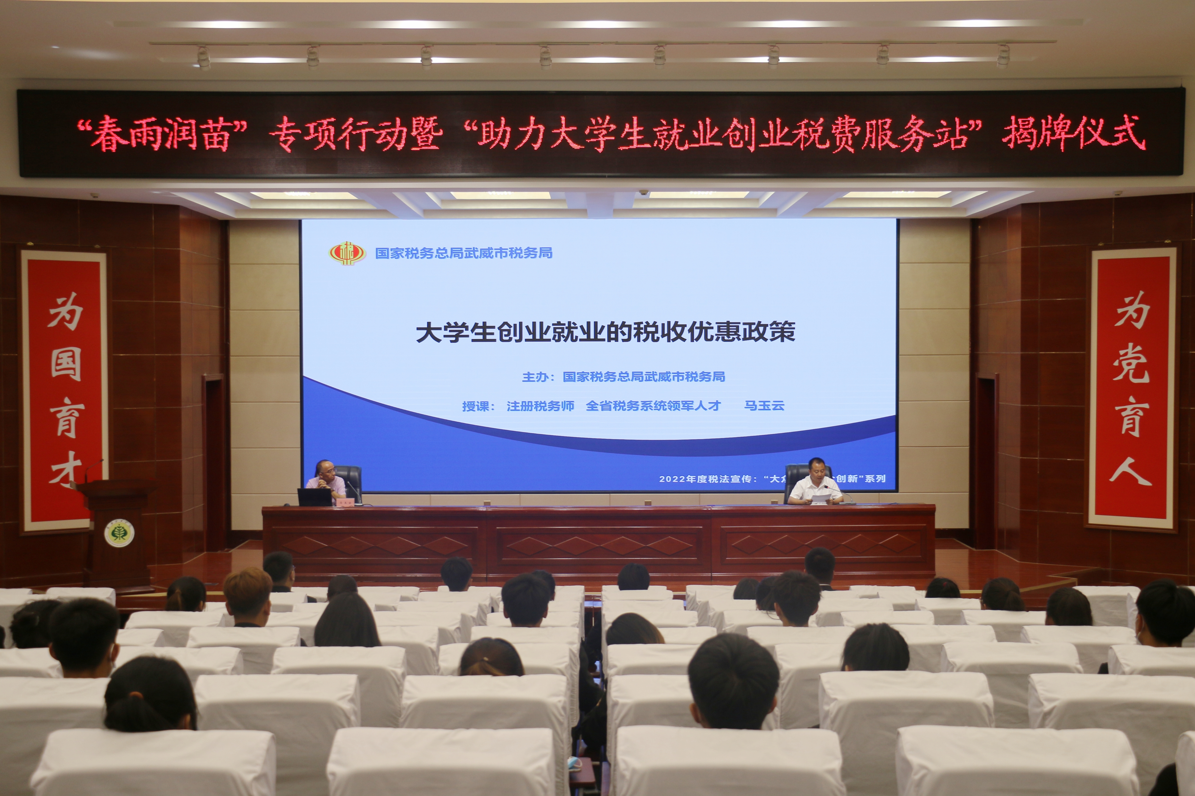 揭牌儀式結束后,武威市稅費專家顧問團隊代表馬玉云為學校師生帶來“就業(yè)創(chuàng)業(yè)稅費第一課”的報告,向大學生們普及稅法知識,特別針對高校畢業(yè)生就業(yè)創(chuàng)業(yè)稅費優(yōu)惠政策、組合式稅費支持政策、個人所得稅政策以及社保繳納等內(nèi)容進行了詳細解讀,為大學生創(chuàng)業(yè)就業(yè)新苗送上一場“及時雨”。