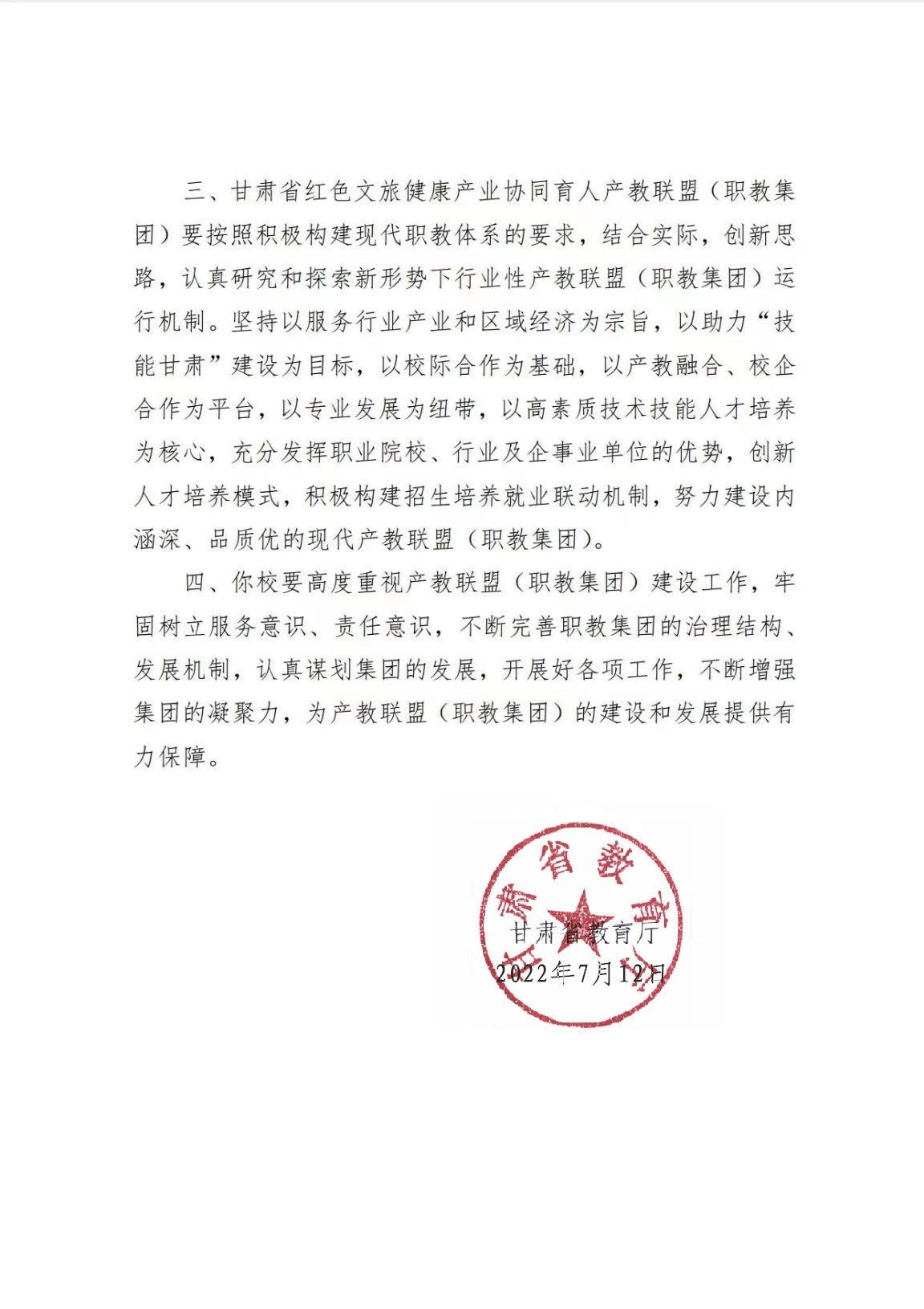 日前,甘肅省教育廳批復我校成立“甘肅省紅色文旅健康產(chǎn)業(yè)協(xié)同育人產(chǎn)教聯(lián)盟(職教集團)”。