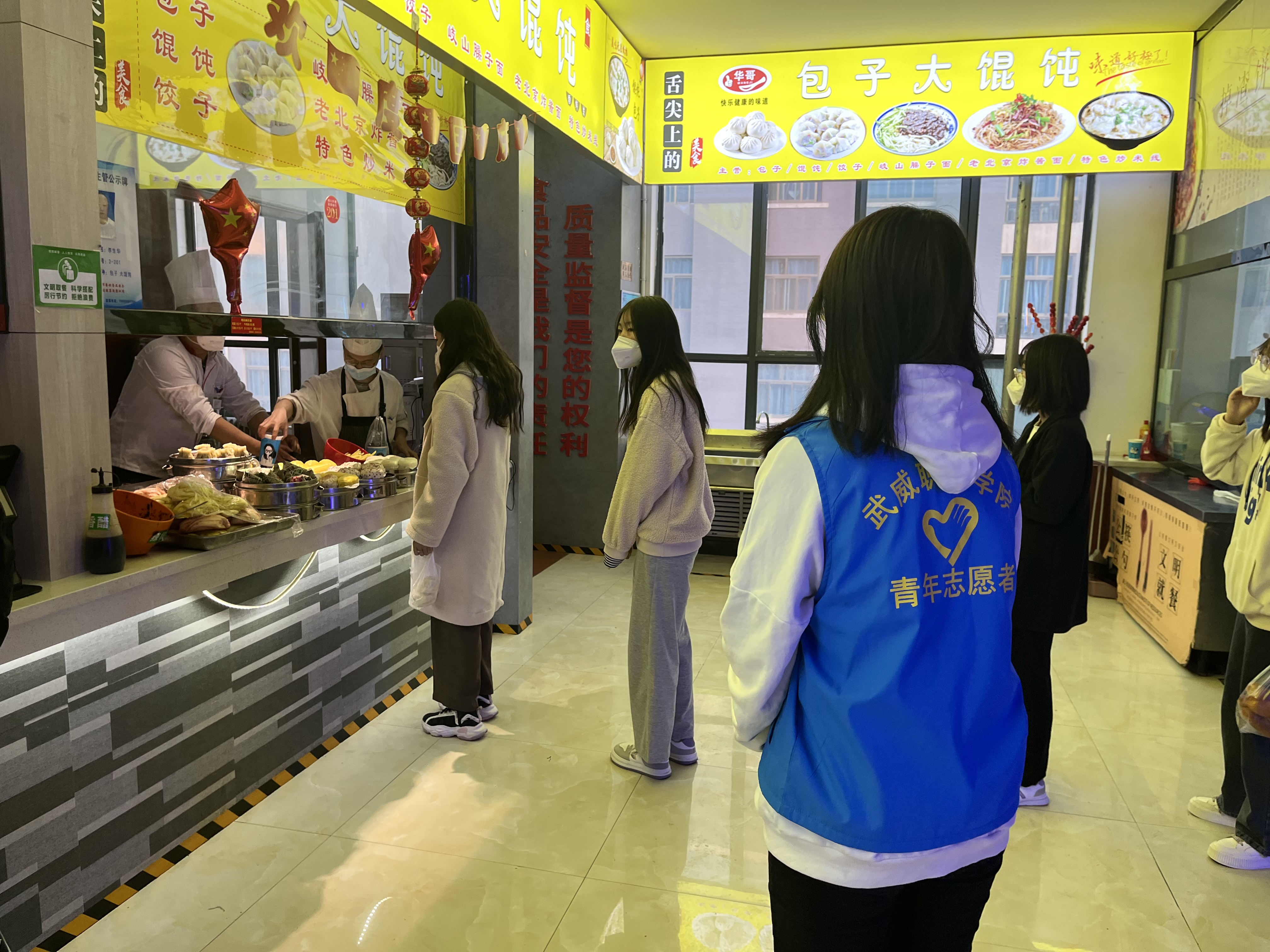 “您好,請(qǐng)測(cè)量體溫、掃場(chǎng)所碼。”“請(qǐng)佩戴好口罩,有序排隊(duì)……”校學(xué)生會(huì)的陶玲在學(xué)校食堂門口值班時(shí)不停地提醒著進(jìn)出打飯的同學(xué)們,這也是她參加校園疫情防控以來每天講得最多的話。自10月13日涼州區(qū)實(shí)施臨時(shí)管控以來,學(xué)校各學(xué)生組織聞令而動(dòng),身穿“藍(lán)馬甲”積極投身校園疫情防控一線,用奉獻(xiàn)溫暖了這個(gè)秋天。