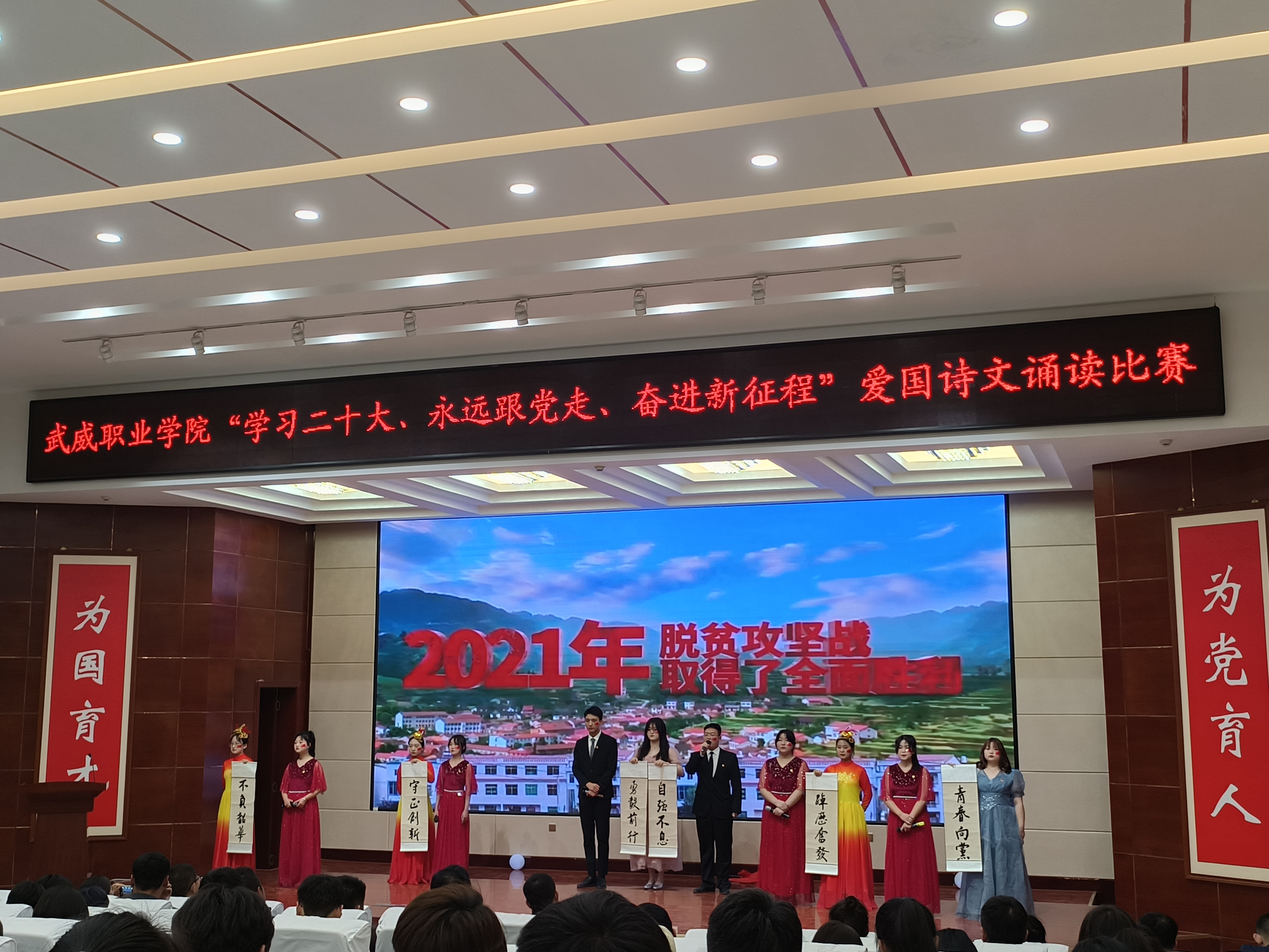 2023年4月20日,藥學院參加武威職業(yè)學院以“學習二十大 永遠跟黨走 奮進新征程”愛國詩文誦讀比賽由校團委牽頭在箐英廳舉行愛國詩文誦讀比賽決賽。邀請到了五位評委老師,現(xiàn)場氛圍如火如荼,所有在場的老師同學都懷有期待迎來了比賽的開始。