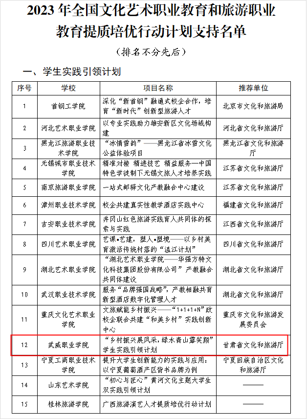 6月8日,文化和旅游部公布2023年全國文化藝術(shù)職業(yè)教育和旅游職業(yè)教育提質(zhì)培優(yōu)行動(dòng)計(jì)劃入選名單,我校申報(bào)的學(xué)生實(shí)踐引領(lǐng)計(jì)劃項(xiàng)目成功入選,是甘肅省唯一入選項(xiàng)目,全國僅15家單位入選。
