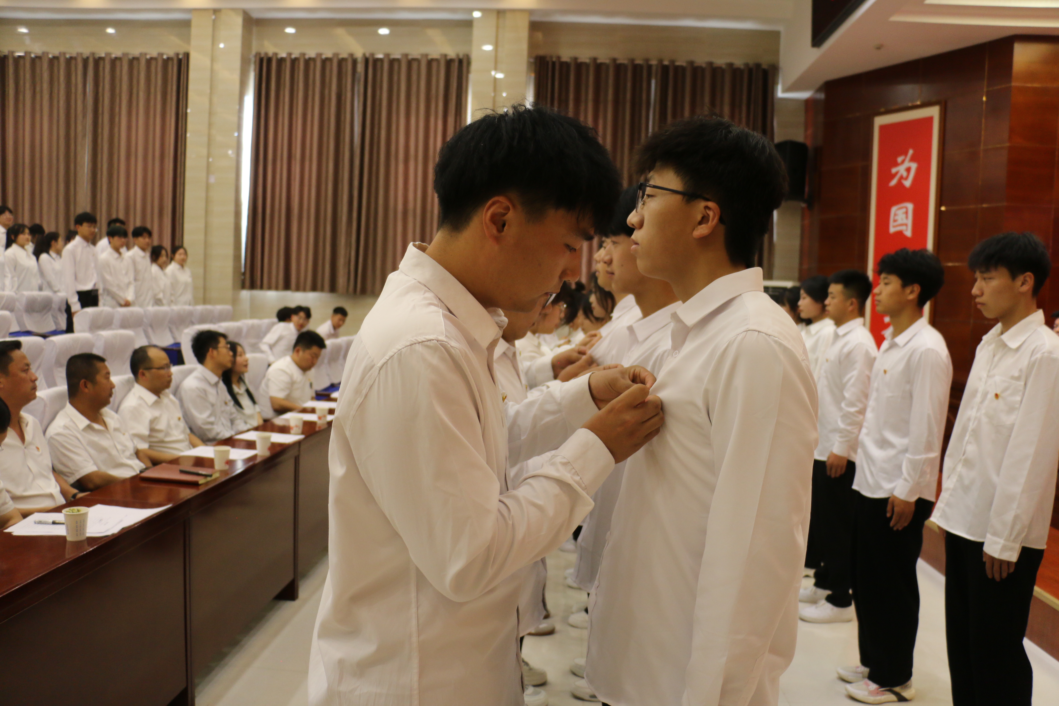 入團儀式上,校團委相關(guān)負責(zé)人宣讀了128名新團員名單,并向新團員闡釋了團徽的組成及象征意義。老團員代表為新團員代表佩戴了團徽,全體團員面對鮮艷的團旗,進行了莊嚴(yán)的宣誓。