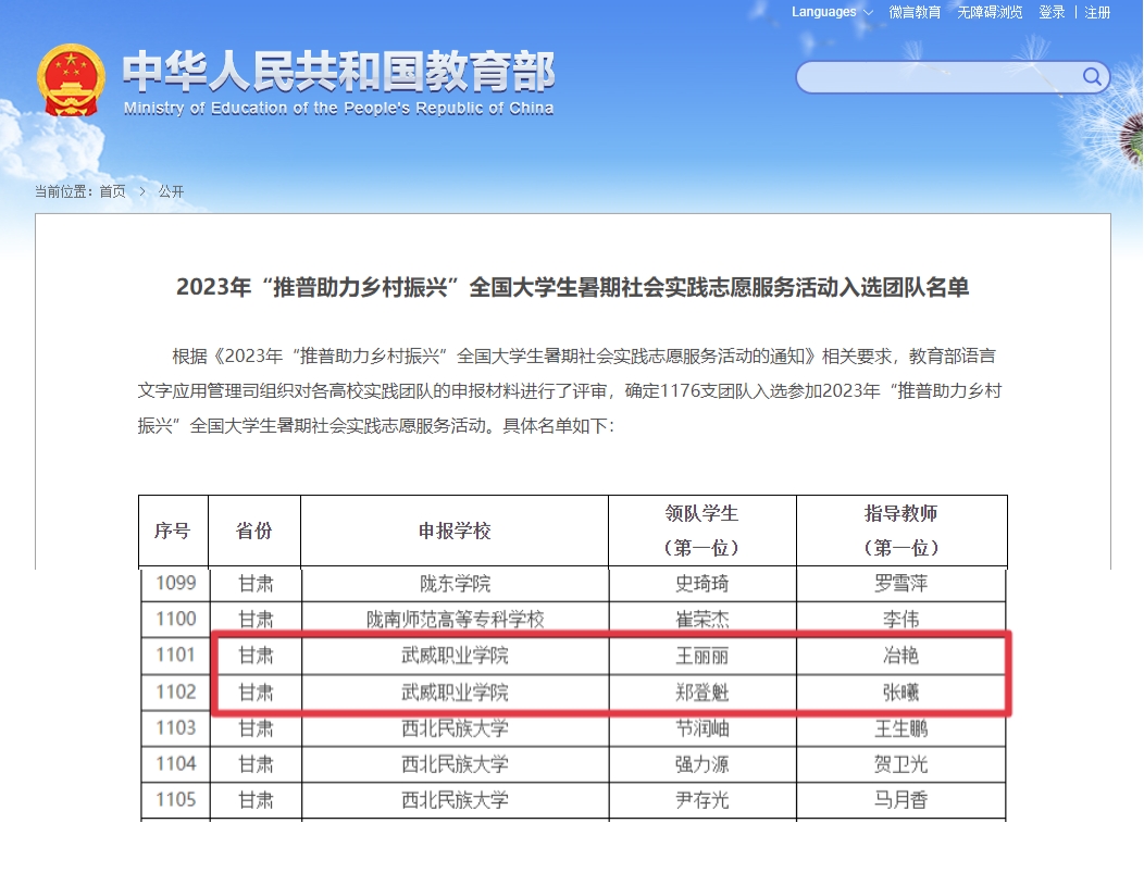 根據(jù)《2023年“推普助力鄉(xiāng)村振興”全國大學生暑期社會實踐志愿服務(wù)活動的通知》相關(guān)要求,近日,教育部語言文字應(yīng)用管理司組織對各高校實踐團隊的申報材料進行了評審,確定1176支團隊入選參加2023年“推普助力鄉(xiāng)村振興”全國大學生暑期社會實踐志愿服務(wù)活動。我?!蓖破砧T民團隊”“推普助力鄉(xiāng)村振興實踐團”成功入選。