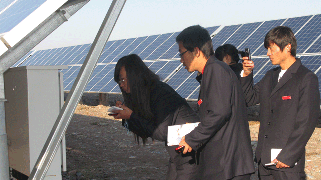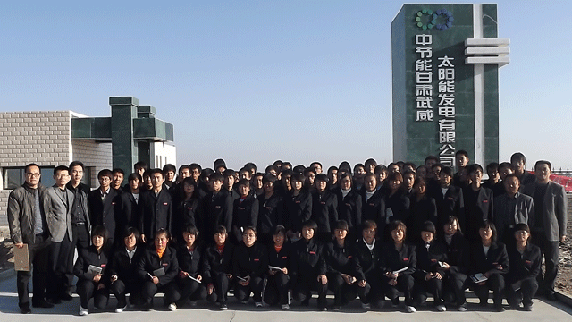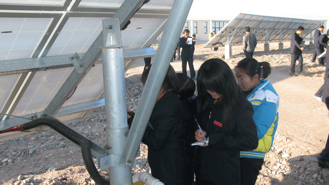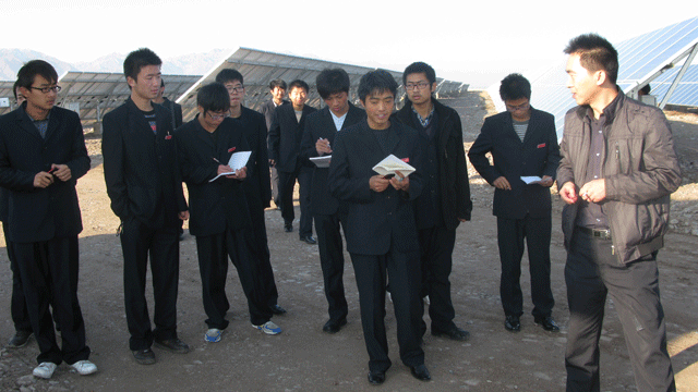 在觀摩學(xué)習(xí)過程中,全體師生受到了園區(qū)管委會工作人員的熱情接待,管委會張國偉主任帶領(lǐng)師生參觀了中節(jié)能甘肅武威太陽能發(fā)電有限公司,公司負(fù)責(zé)人向大家介紹了園區(qū)建設(shè)情況,從多晶硅、單晶硅的提煉、太陽能電池板的生產(chǎn)制造到光伏電站的建設(shè),對光伏發(fā)電產(chǎn)業(yè)鏈進(jìn)行了較詳盡的講述。同學(xué)們看到園區(qū)內(nèi)一排排整齊擺置的太陽能電池板方陣時,都流露出激動崇敬的神情,一個個邊走邊看,并伸手觸摸太陽能電池板。同學(xué)們就光伏發(fā)電的原理、電池使用壽命、光電轉(zhuǎn)換效率以及光伏電站的運行維護(hù)等方面的專業(yè)知識向負(fù)責(zé)人請教,面對大家的疑問,園區(qū)負(fù)責(zé)人都耐心細(xì)致的做了解答。