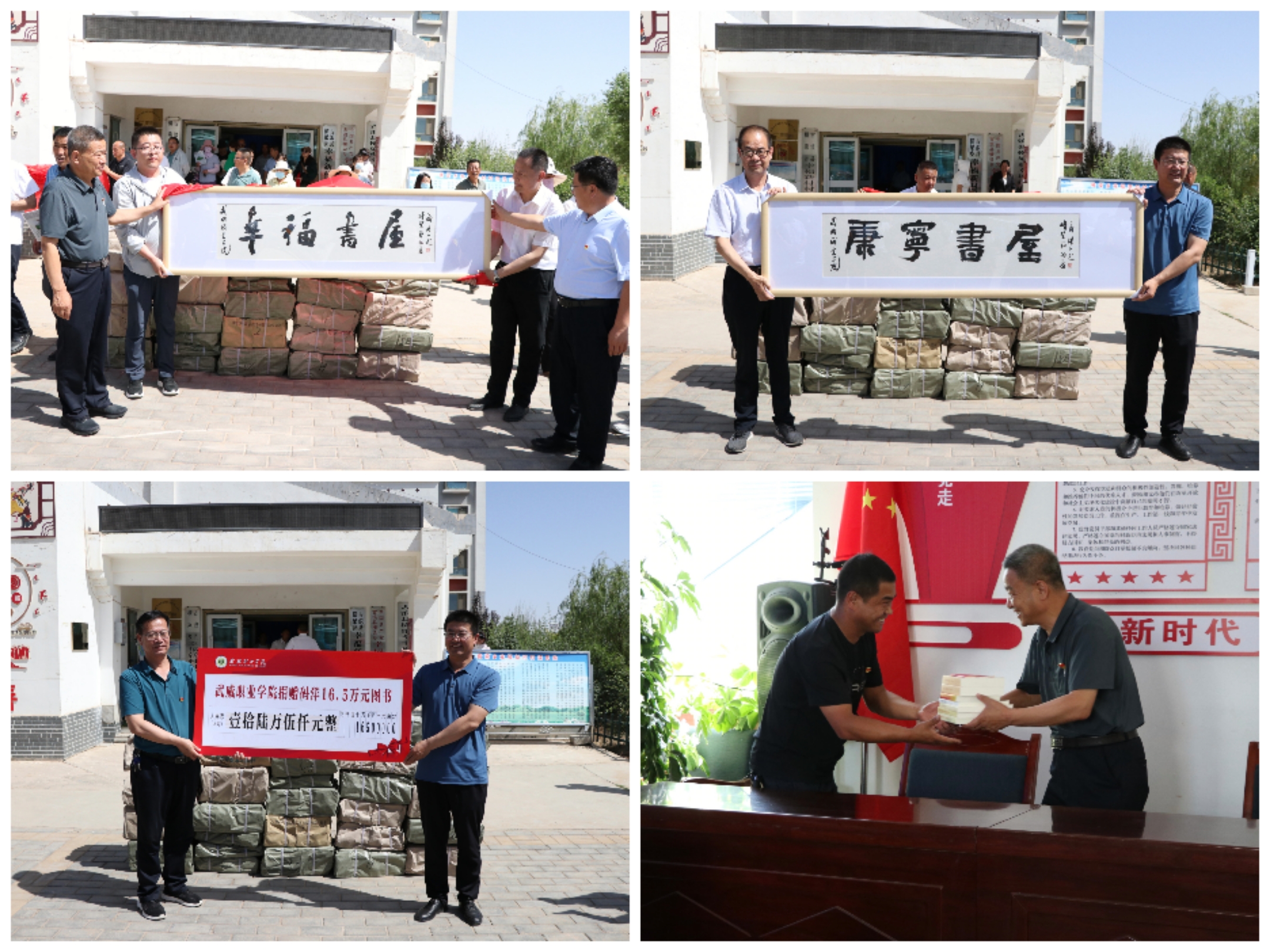 趙明、何文國就文化振興項目進行了深入交流,簽訂了《定向幫扶捐贈協(xié)議》《武威職業(yè)學院在橫梁鄉(xiāng)幸福新村、康寧新村捐建開放式農(nóng)家書屋的協(xié)議書》,雙方代表為幸福書屋、康寧書屋揭牌,學校為橫梁鄉(xiāng)捐贈文化振興專項資金13萬元和碼洋16.5萬元的圖書。
