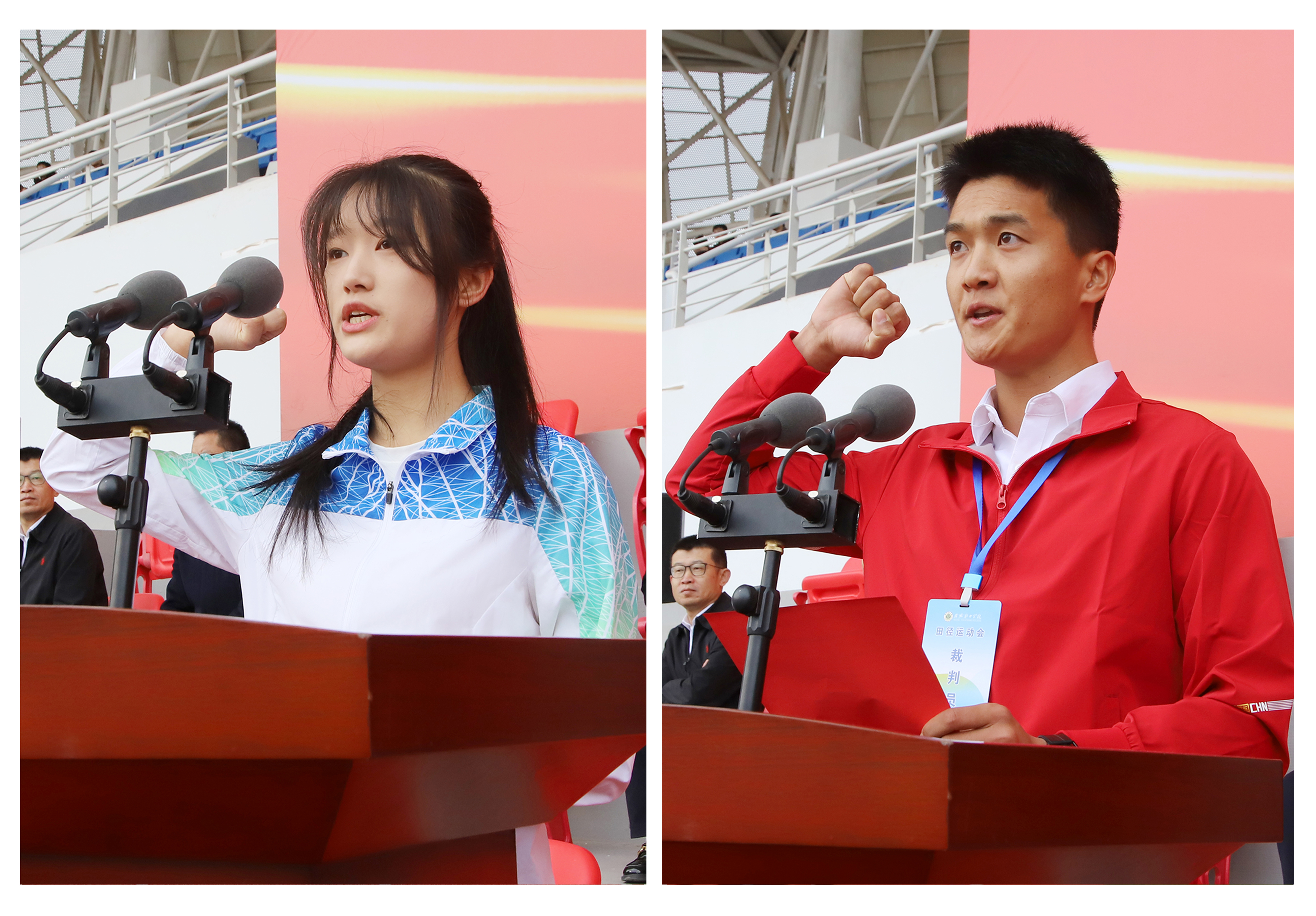 開幕式上,侯昊燁同學和吳績?nèi)鹄蠋煼謩e代表運動員和裁判員進行了莊嚴的宣誓。
