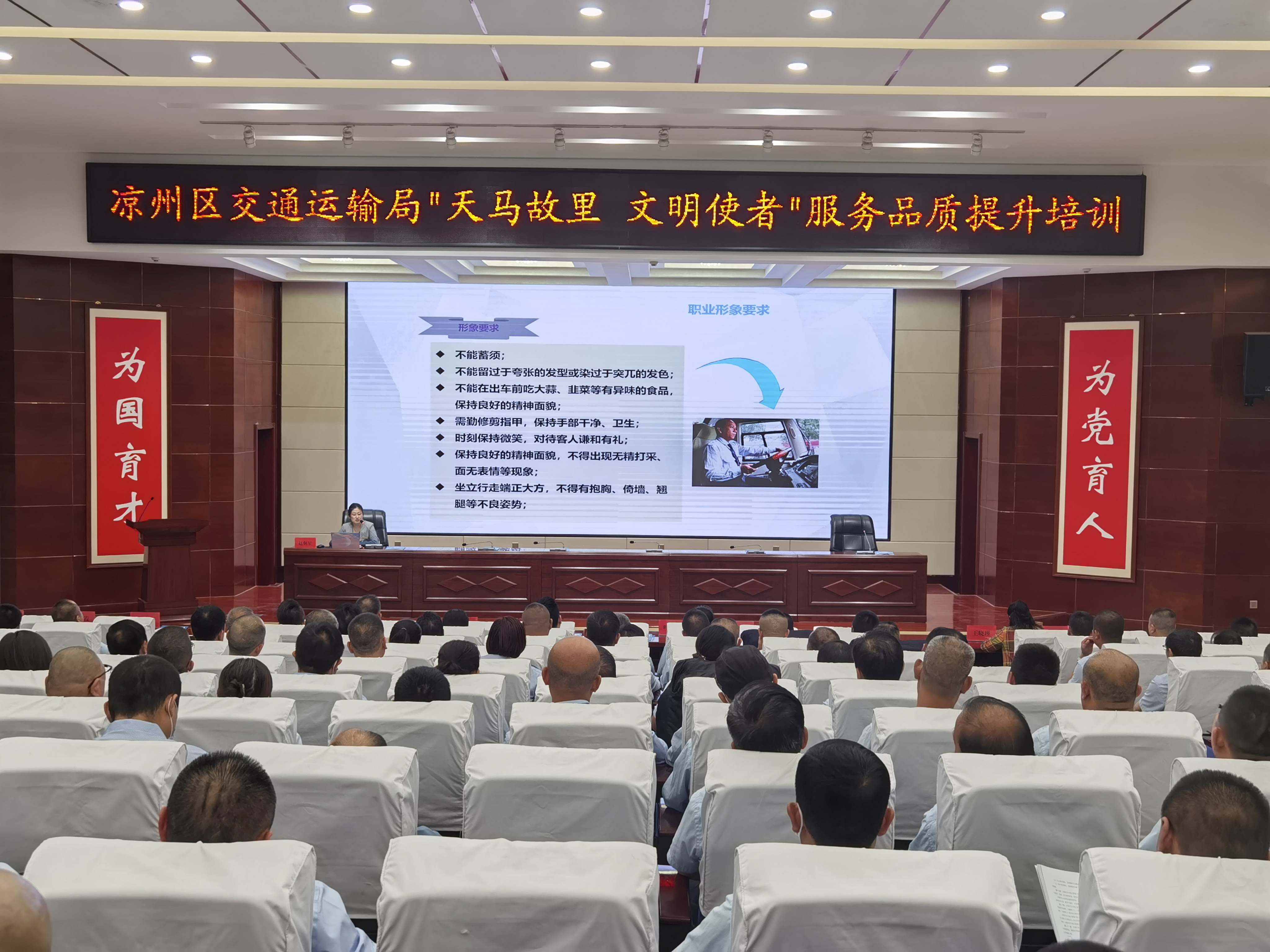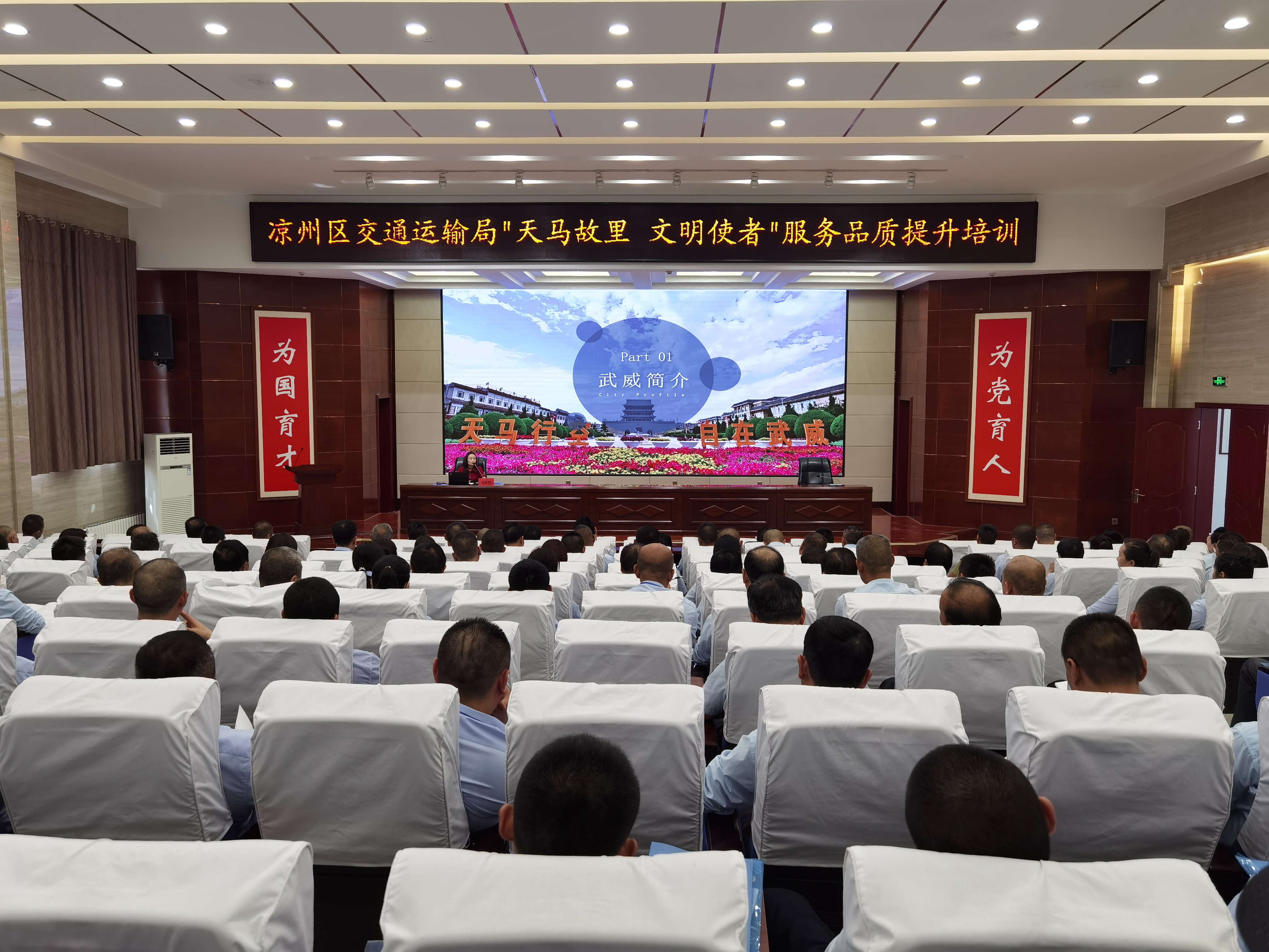 6月28日,“天馬故里 文明使者”客運(yùn)企業(yè)從業(yè)人員服務(wù)品質(zhì)提升培訓(xùn)班在武威職業(yè)學(xué)院開班。市交通局副局長柴天祥,區(qū)委常委、統(tǒng)戰(zhàn)部部長、區(qū)政協(xié)黨組書記許娜,市交通運(yùn)輸綜合行政執(zhí)法隊(duì)隊(duì)長韓世泰,市運(yùn)管局副局長許培明,學(xué)校黨委委員、副校長王守云出席開班儀式。開班式由涼州區(qū)交通運(yùn)輸局副局長蘇銀堂主持,出租客運(yùn)公司、城市公交公司和定制客運(yùn)公司管理人員及從業(yè)人員220人參加開班儀式。