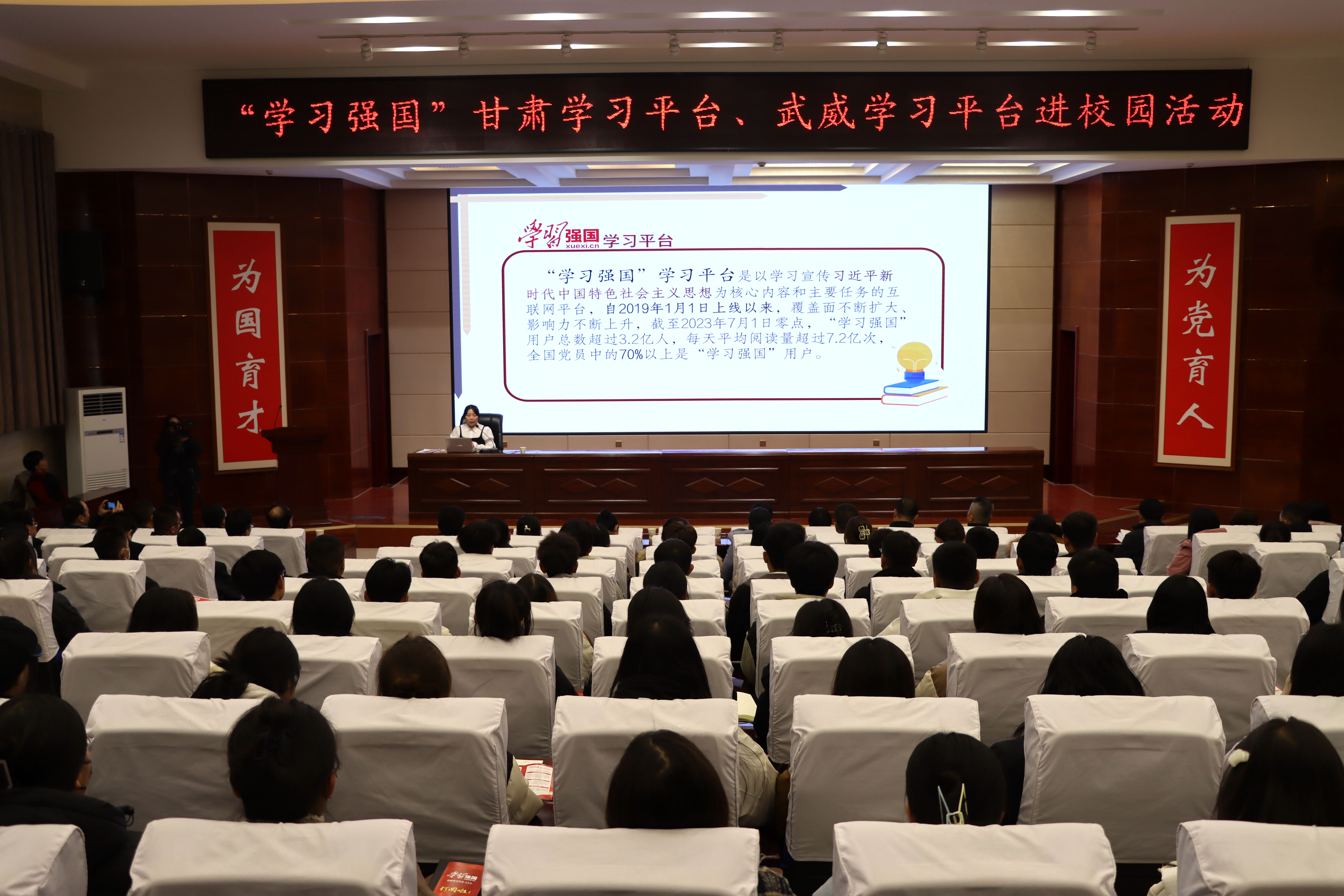 11月28日下午,“學(xué)習(xí)強(qiáng)國”甘肅學(xué)習(xí)平臺、武威學(xué)習(xí)平臺進(jìn)校園活動(dòng)在學(xué)校菁英廳舉辦,省委講師團(tuán)副團(tuán)長張啟曄、市委講師團(tuán)團(tuán)長蔡生菊出席了活動(dòng),活動(dòng)由學(xué)校黨委委員、副校長何毅主持。