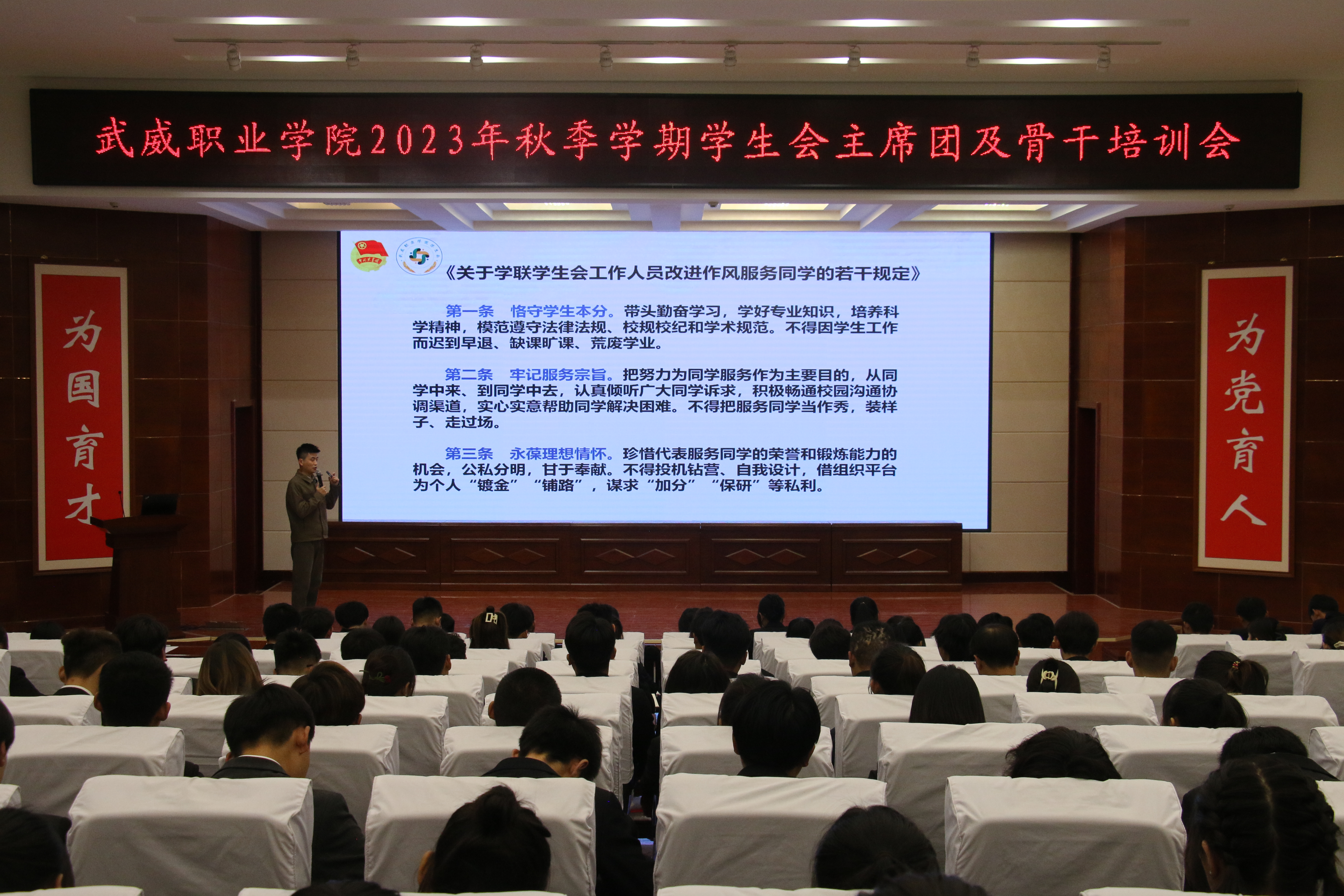 校學(xué)生會(huì)主席團(tuán)成員帶頭領(lǐng)學(xué)了《關(guān)于學(xué)聯(lián)學(xué)生會(huì)工作人員改進(jìn)作風(fēng)服務(wù)同學(xué)的若干規(guī)定》《武威職業(yè)學(xué)院學(xué)生會(huì)章程》等制度文件。學(xué)生會(huì)秘書長張登海以《微光凝聚星海,筑夢情懷方舟》為題,圍繞加強(qiáng)思想政治建設(shè)、深化學(xué)生會(huì)組織改革和進(jìn)一步加強(qiáng)從嚴(yán)治會(huì)等方面,為學(xué)生會(huì)組織成員展開培訓(xùn)。