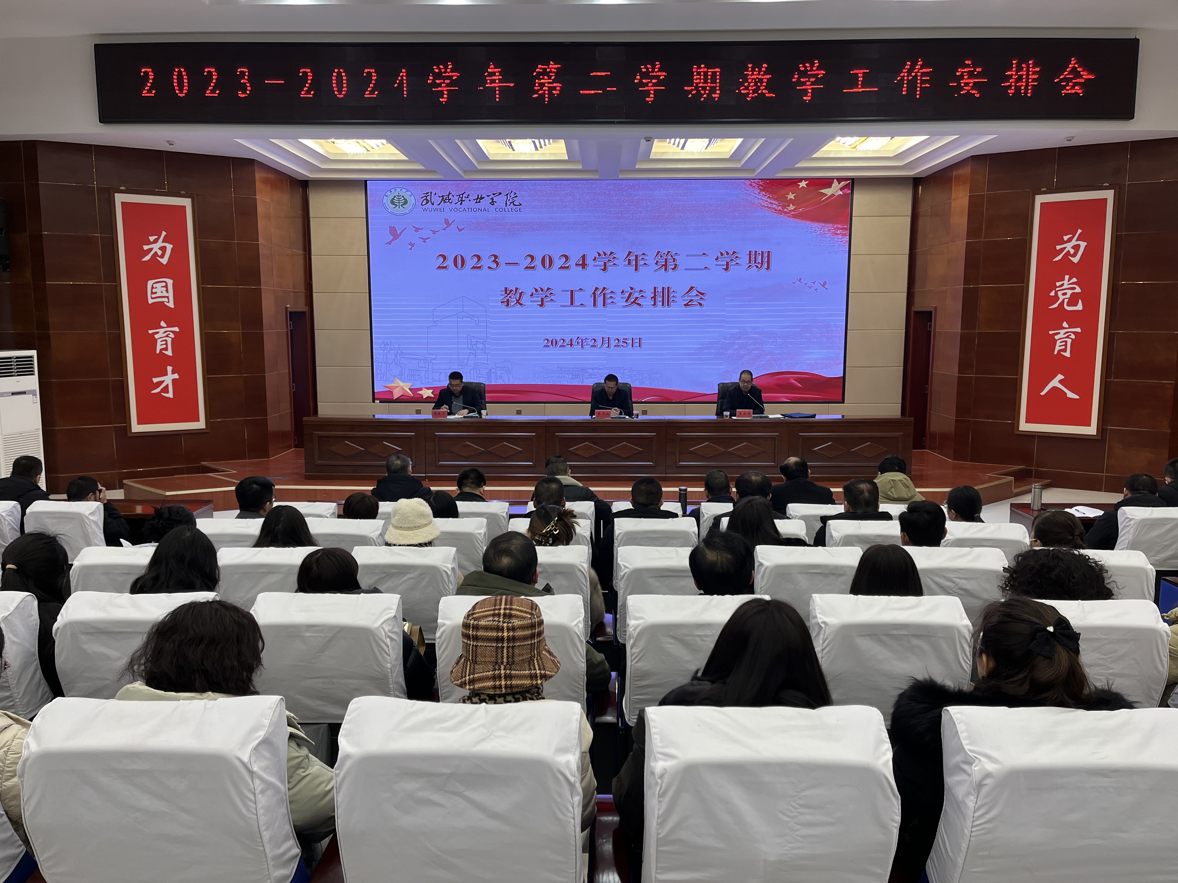 為持續(xù)推動教學(xué)運(yùn)行與管理規(guī)范化、標(biāo)準(zhǔn)化、科學(xué)化,進(jìn)一步提升新學(xué)期教學(xué)工作成效和人才培養(yǎng)質(zhì)量,扎實(shí)推進(jìn)學(xué)校高質(zhì)量建設(shè),2月25日上午,學(xué)校在菁英廳組織召開了2023-2024學(xué)年第二學(xué)期教學(xué)工作安排會。學(xué)校校長、黨委副書記張開禮、黨委副書記翟存祥、各二級學(xué)院負(fù)責(zé)人、教學(xué)秘書、教研室主任、各專業(yè)帶頭人和教務(wù)處全體工作人員參加了會議。會議由翟存祥主持。