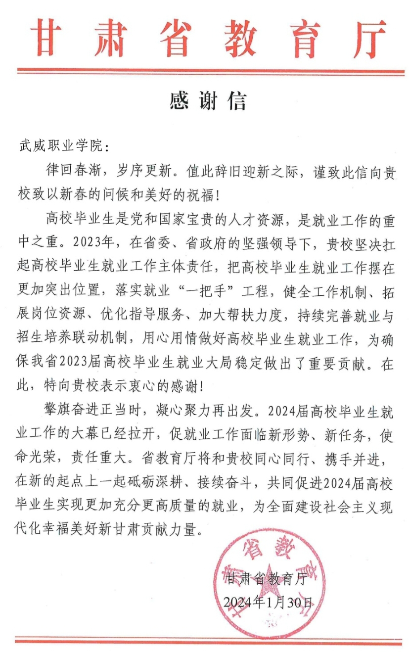 近日,甘肅省教育廳向我校發(fā)來感謝信,信中對學(xué)校為2023屆高校畢業(yè)生就業(yè)工作做出的重要貢獻(xiàn)致以感謝,對學(xué)校在高校畢業(yè)生就業(yè)工作中的突出表現(xiàn)作出肯定,表揚(yáng)學(xué)校堅決扛起高校畢業(yè)生就業(yè)工作主體責(zé)任,把高校畢業(yè)生就業(yè)工作擺在更加突出位置,落實就業(yè)“一把手”工程,健全工作機(jī)制、拓展崗位資源、優(yōu)化指導(dǎo)服務(wù)、加大幫扶力度,持續(xù)完善就業(yè)與招生培養(yǎng)聯(lián)動機(jī)制,用心用情做好高校畢業(yè)生就業(yè)工作。