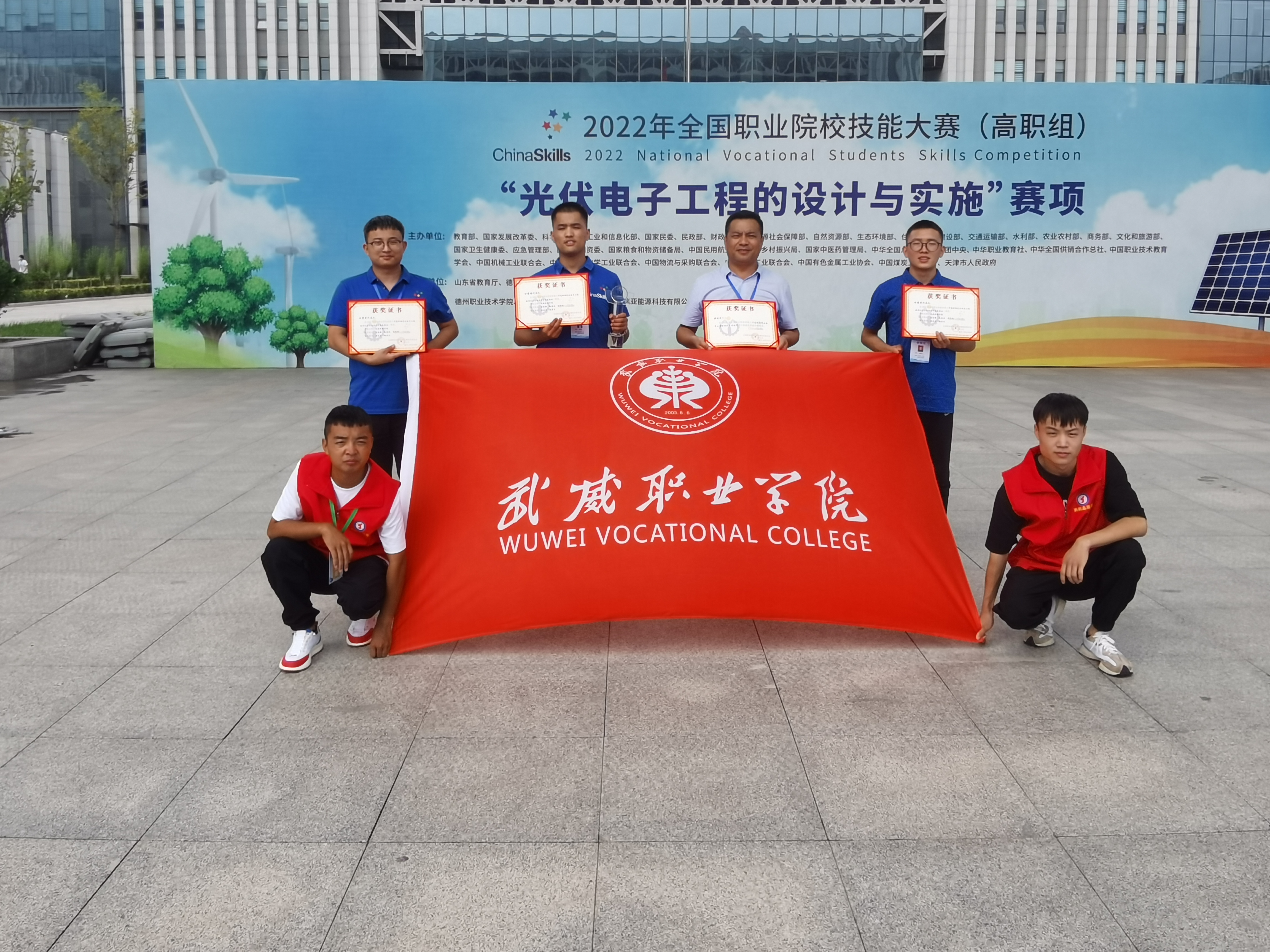 8月22日至23日,由教育部、工業(yè)和信息化部、財政部、人力資源和社會保障部、住房和城鄉(xiāng)建設部、交通運輸部、農(nóng)業(yè)部等部委主辦的2022年全國職業(yè)院校技能大賽高職組“光伏電子工程的設計與實施”賽項在山東德州職業(yè)技術學院舉辦,來自全國30個省(市)、自治區(qū)的55支代表隊參加了比賽。武威職業(yè)學院中科低碳新能源技術學院高東興、富金強、趙寶林三名同學代表甘肅省參加本次大賽,最終榮獲國賽一等獎,完全實現(xiàn)了賽前確定的“穩(wěn)二爭一”的目標任務。這是學校參加全國職業(yè)院校技能大賽以來首次獲得國賽一等獎,實現(xiàn)了學校該賽項國獎“零”的突破,開啟了學校專業(yè)建設高質(zhì)量發(fā)展新征程。本次優(yōu)異成績的取得充分展現(xiàn)了學校“崗課賽證”相融通的綜合育人效果,充分體現(xiàn)了學校深化“三教改革”推動高質(zhì)量發(fā)展的成效,充分彰顯了學校實施“雙高計劃”“技能甘肅”“提質(zhì)培優(yōu)”等重大項目建設推進高水平發(fā)展的成效,本次競賽成績是對學校新能源類專業(yè)建設的肯定,也是武威乃至全省職業(yè)教育發(fā)展的試金石和榮光。