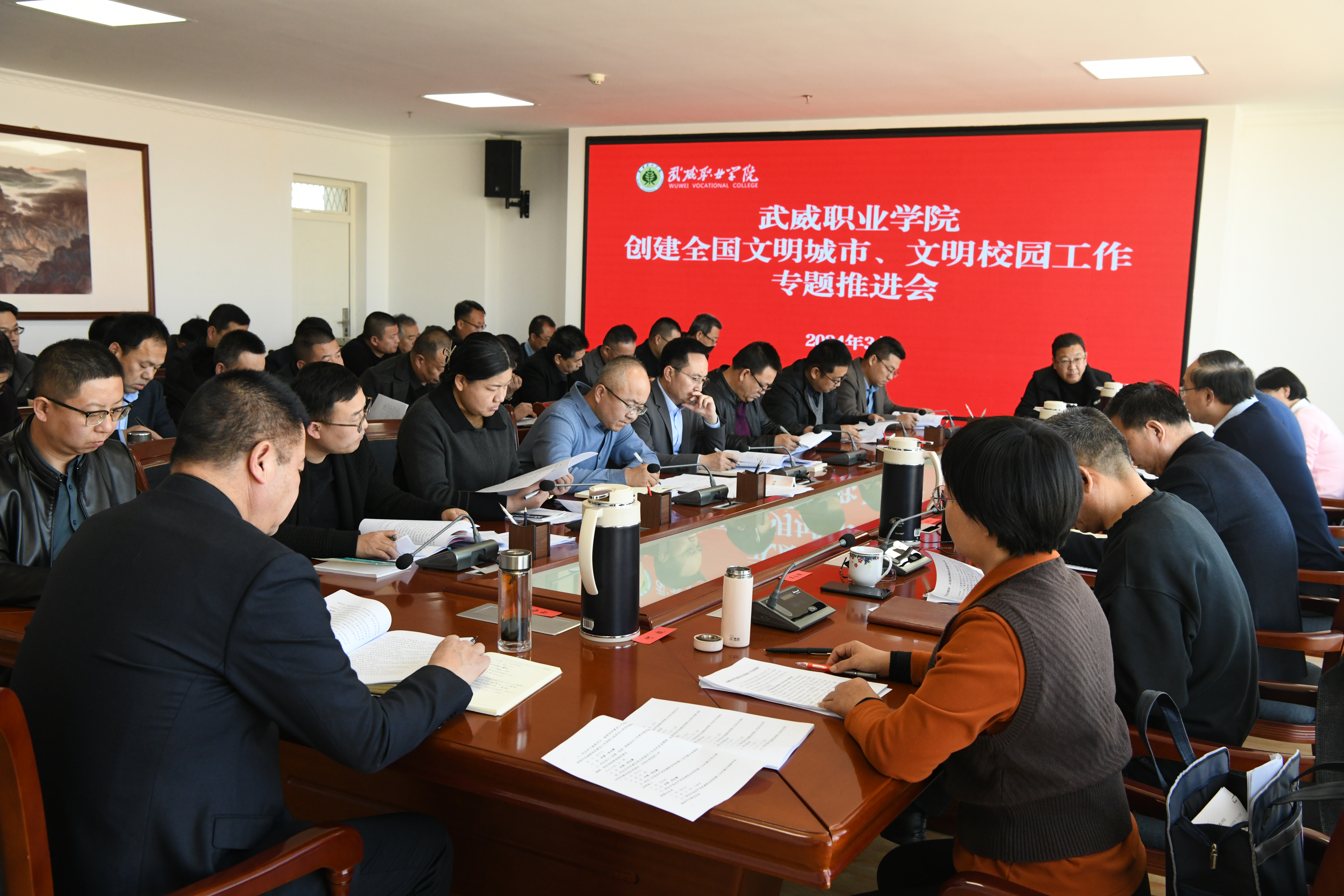 根據“武威市創(chuàng)建全國文明城市工作動員大會”精神,3月8日下午,學校在能源科技樓811會議室召開了2024年創(chuàng)建全國文明城市、文明校園專題工作推進會。黨委書記王宏,校長、副書記張開禮,黨委副書記翟存祥,副校長王永緒、田迎春、何毅,紀委書記、監(jiān)察專員陳曉煜,副校長王守云出席會議,各黨總支、直屬黨支部書記,各部門、二級學院負責人參加會議。會議由黨委書記王宏主持并作了講話。