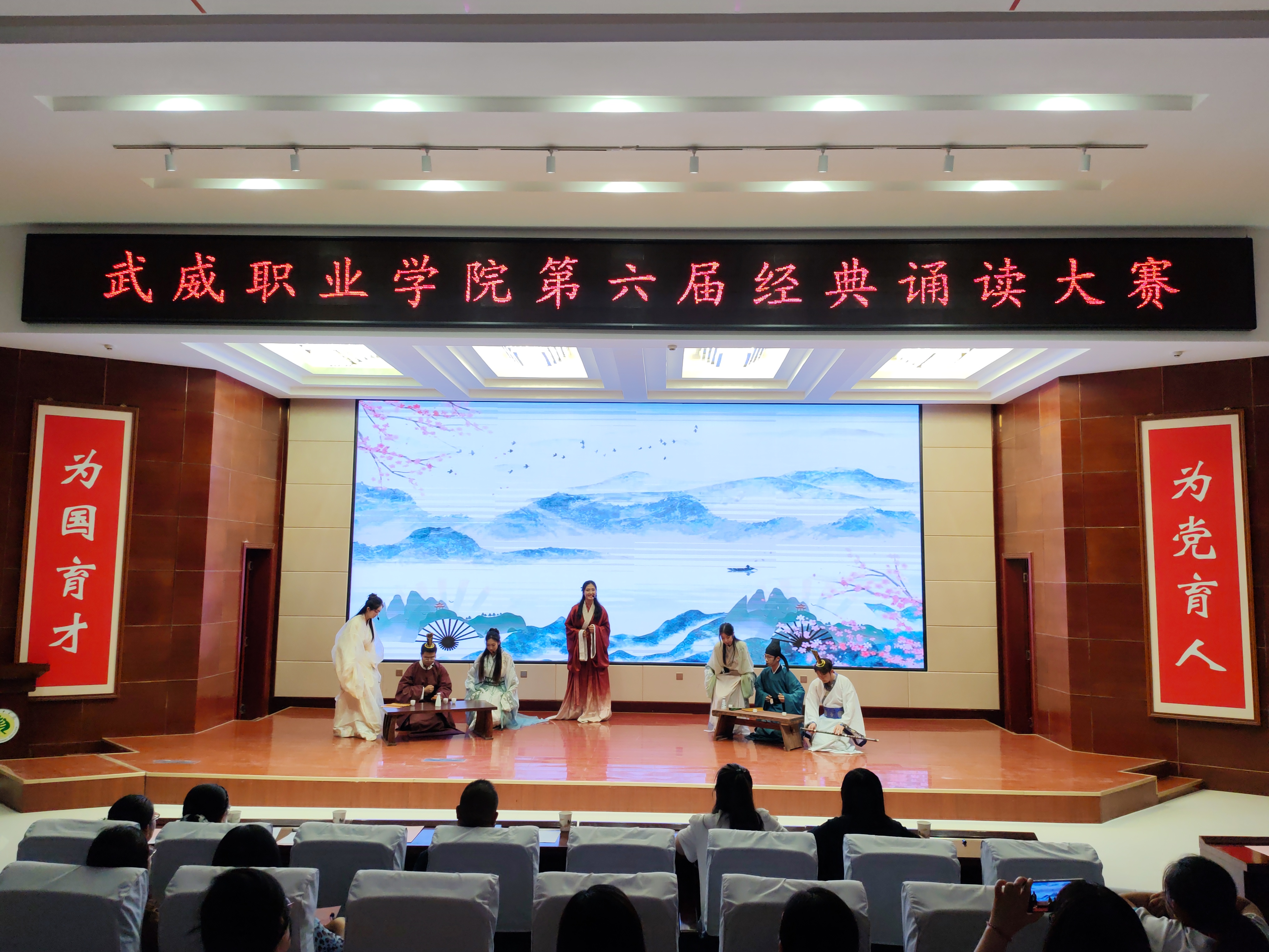 為深化全民閱讀活動開展,引領社會大眾親近中華經典,傳承弘揚中華優(yōu)秀文化,齊心共書強國新篇章,武威職業(yè)學院第六屆經典誦讀大賽于6月4日在菁英廳成功舉辦。黨委委員、副校長田迎春,科研處處長蔡柱山出席比賽現(xiàn)場,邀請語言文字專業(yè)5位評委為教師組、學生組、留學生組共20件參賽作品進行現(xiàn)場評分。