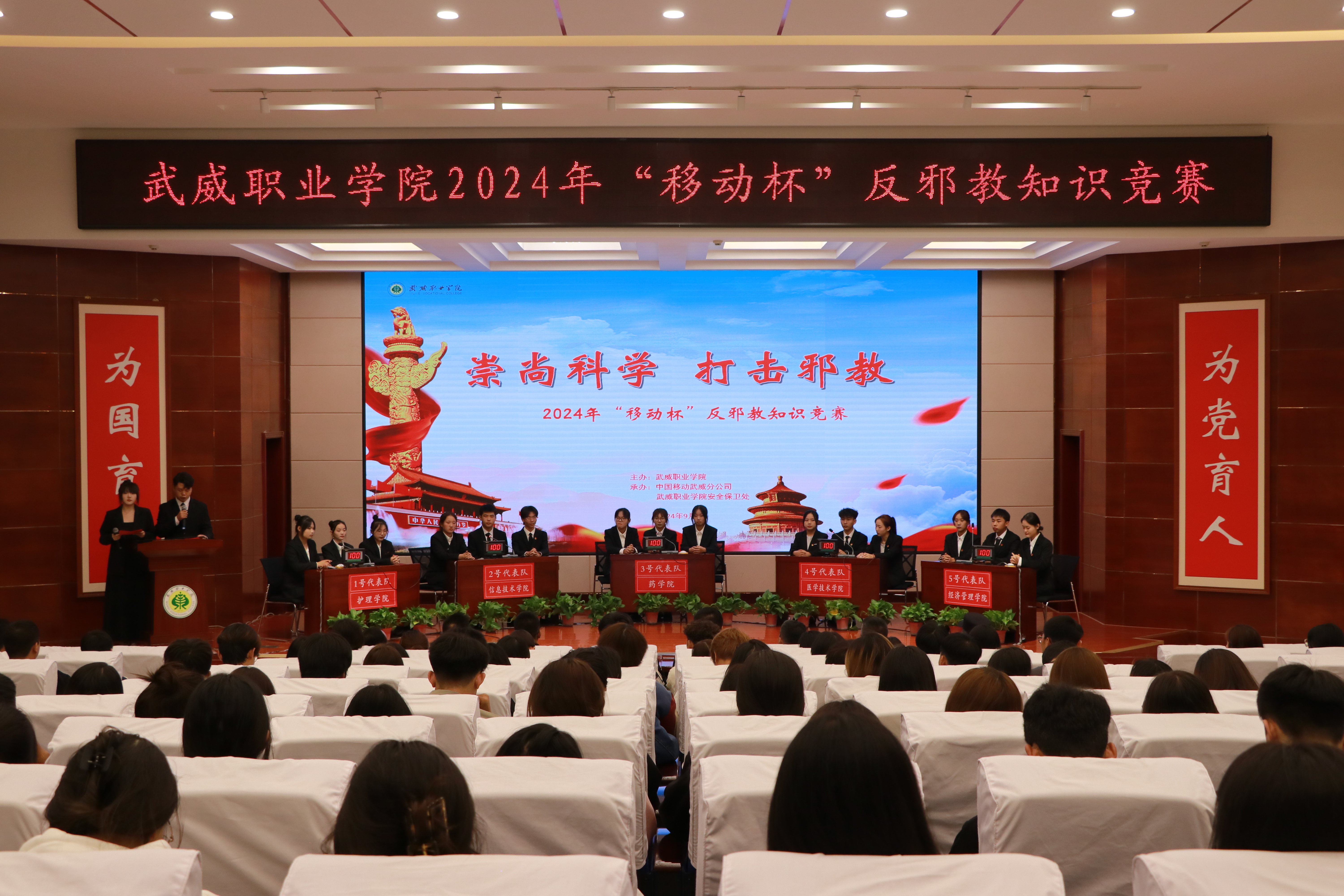 為全面貫徹落實防邪反邪工作,進(jìn)一步提高廣大師生對邪教組織反動本質(zhì)的認(rèn)識,切實增強(qiáng)識別邪教、抵制邪教的能力。9月13日,在學(xué)校菁英廳舉辦了2024年“移動杯”反邪教知識競賽。學(xué)校黨委委員、紀(jì)委書記陳曉煜、宣傳統(tǒng)戰(zhàn)部、學(xué)生工作部、安全保衛(wèi)處、校團(tuán)委負(fù)責(zé)人出席活動,各二級學(xué)院200余名師生觀看了比賽。