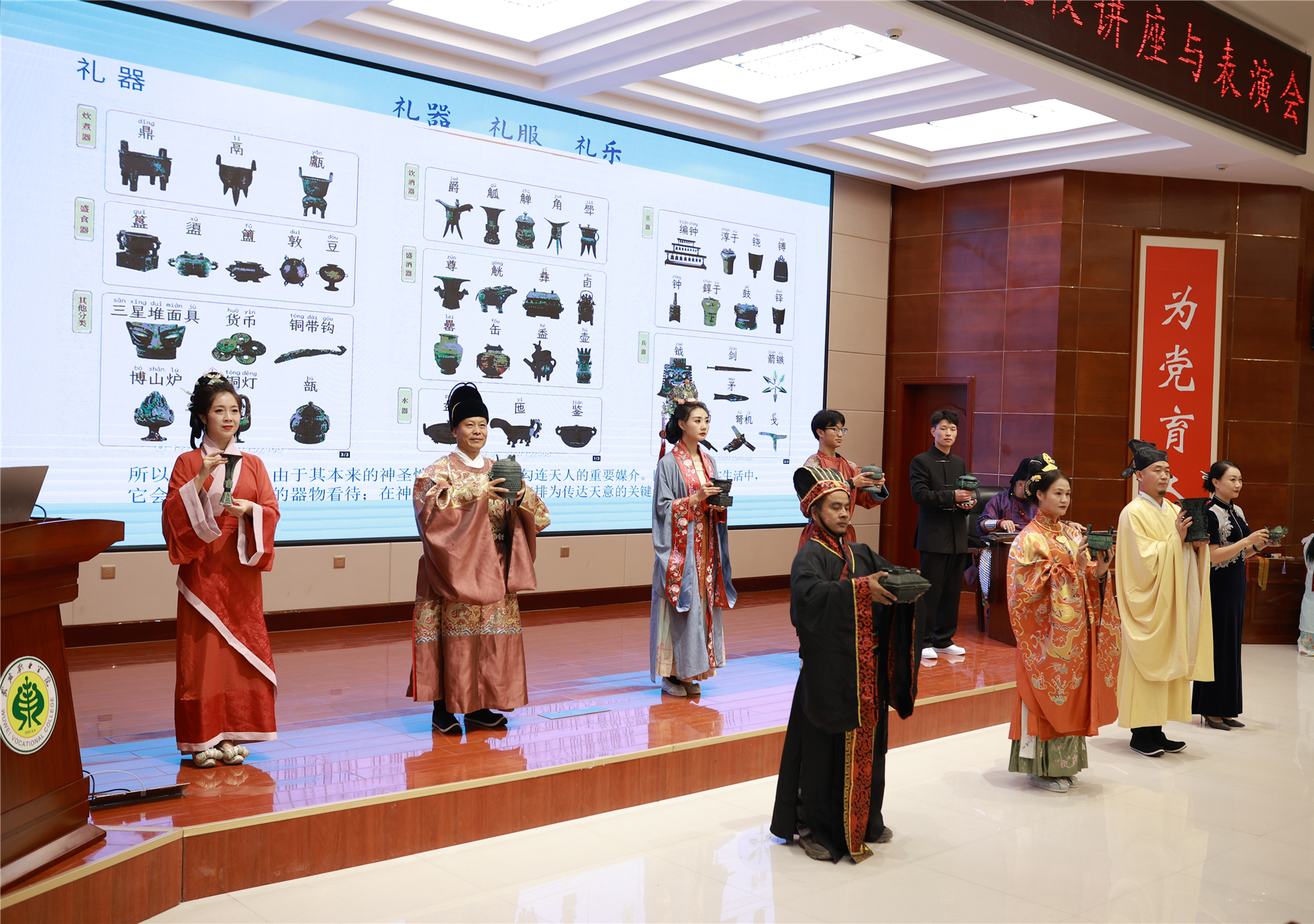馮國春老師以深厚的學(xué)識和豐富的經(jīng)驗,詳細(xì)向?qū)W生們講解了各個歷史時期的傳統(tǒng)禮儀,從禮器、禮服到禮樂,每一個朝代都生動而詳盡。團(tuán)隊成員將禮儀通過現(xiàn)場示范的方式呈現(xiàn)給在場的每一位同學(xué)。他們不僅展示了禮儀的外在形式,更傳達(dá)了禮儀背后的文化內(nèi)涵和精神價值。