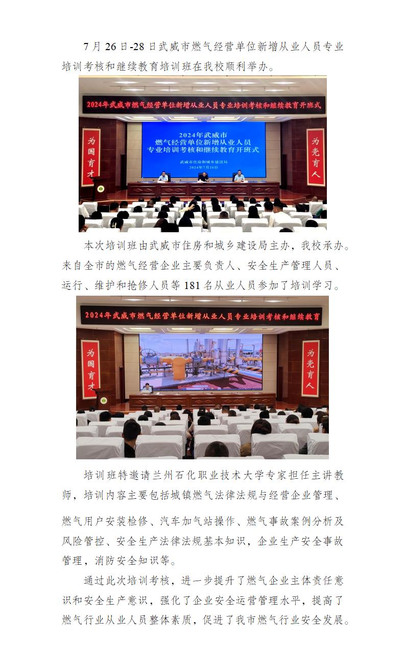 2024年武威市燃?xì)饨?jīng)營(yíng)單位新增從業(yè)人員專(zhuān)業(yè)培訓(xùn)考核和繼續(xù)教育培訓(xùn)班在我校成功舉辦