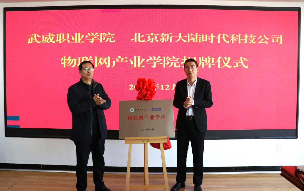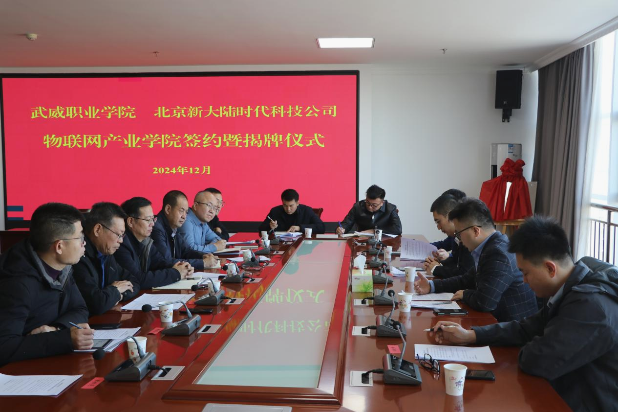 為全面深化產(chǎn)教融合,加強(qiáng)校企合作,進(jìn)一步提高我校人才培養(yǎng)質(zhì)量。12月3日,學(xué)校在能源科技樓811會(huì)議室舉行武威職業(yè)學(xué)院和北京新大陸時(shí)代科技公司物聯(lián)網(wǎng)產(chǎn)業(yè)學(xué)院簽約暨揭牌儀式。北京新大陸時(shí)代科技公司西北區(qū)總監(jiān)劉寧、技術(shù)總監(jiān)樊斌,相關(guān)業(yè)務(wù)部門(mén)負(fù)責(zé)人,學(xué)校校長(zhǎng)、黨委副書(shū)記張開(kāi)禮、黨委副書(shū)記翟存祥、相關(guān)部門(mén)負(fù)責(zé)人及教師代表參加活動(dòng)。黨委委員、副校長(zhǎng)王永緒主持儀式。
