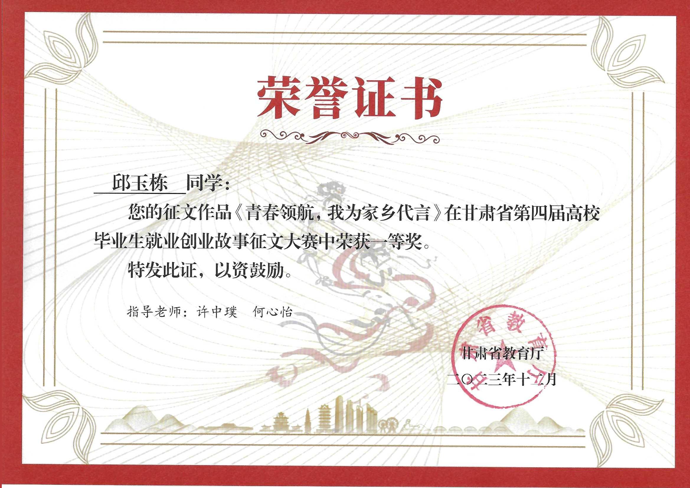 2023年學生在甘肅省第四屆高校畢業(yè)生就業(yè)創(chuàng)業(yè)故事征文大賽獲一等獎
