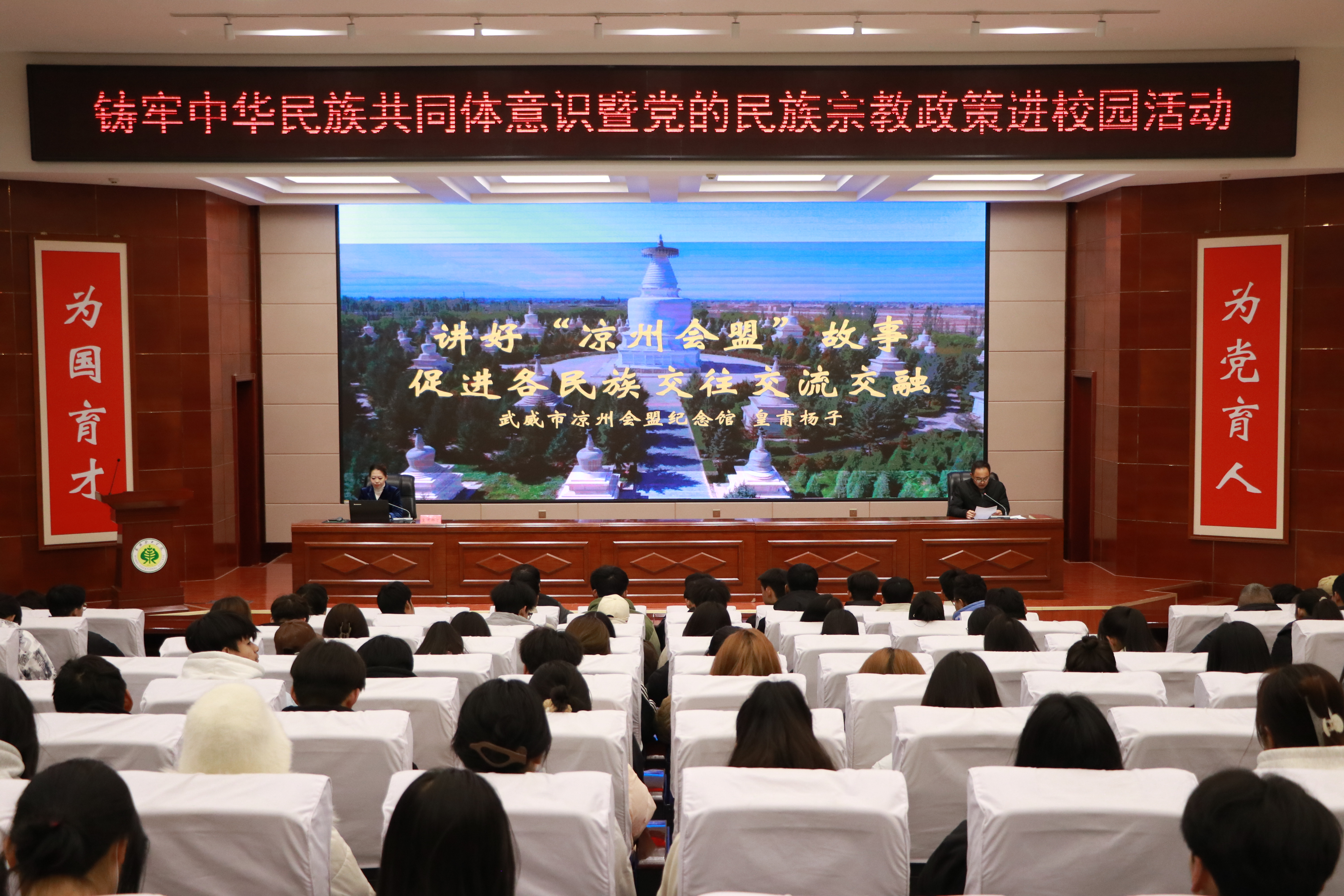 12月19日,學校聯(lián)合武威市涼州會盟紀念館,成功舉辦了鑄牢中華民族共同體意識暨民族宗教政策進校園系列活動?;顒庸参?00余名師生參觀聽講。