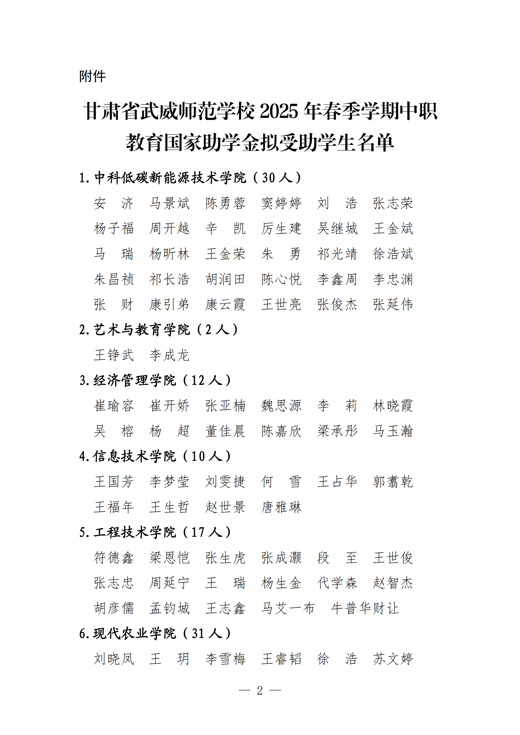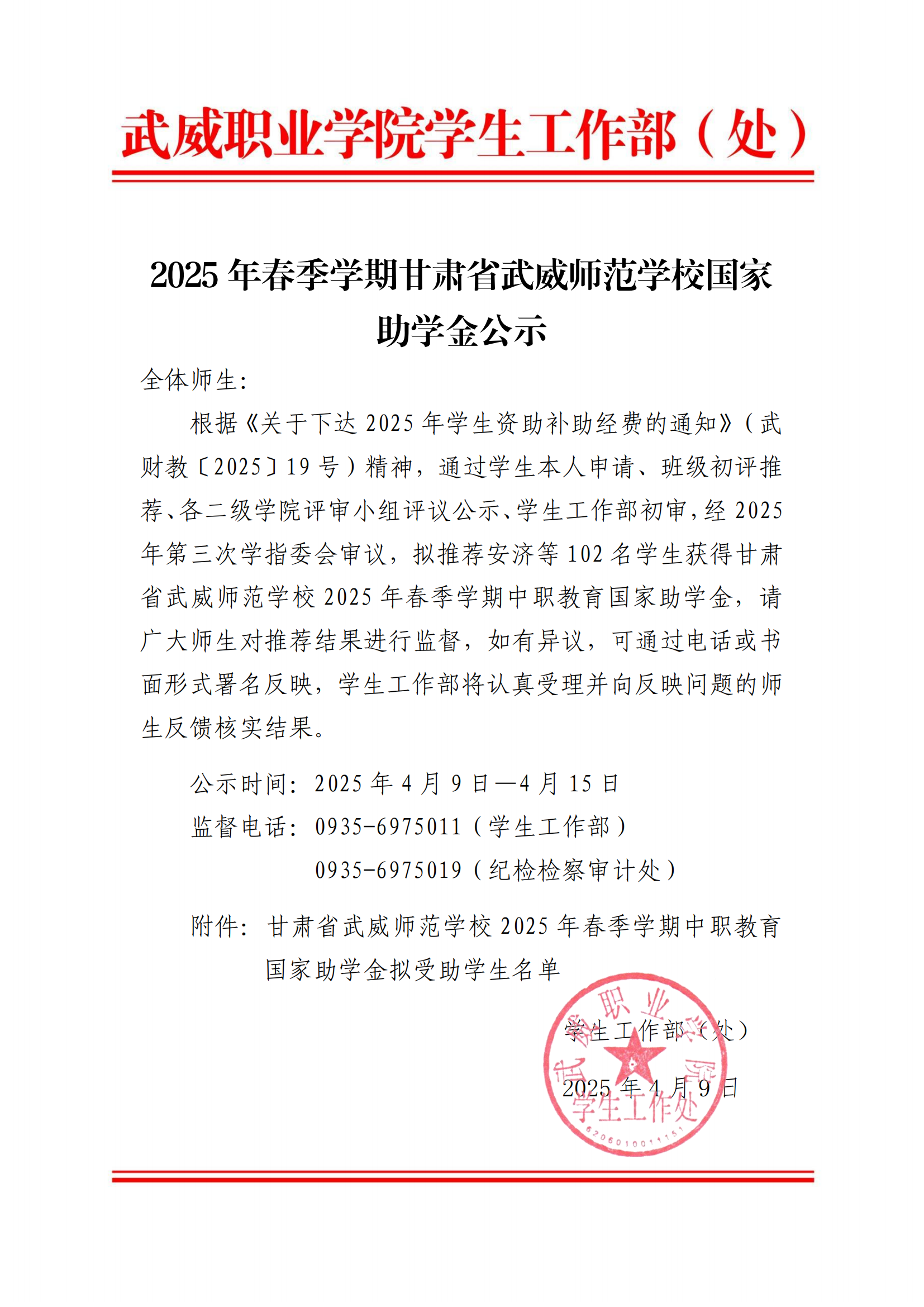 2025年春季學(xué)期甘肅省武威師范學(xué)校國(guó)家助學(xué)金公示