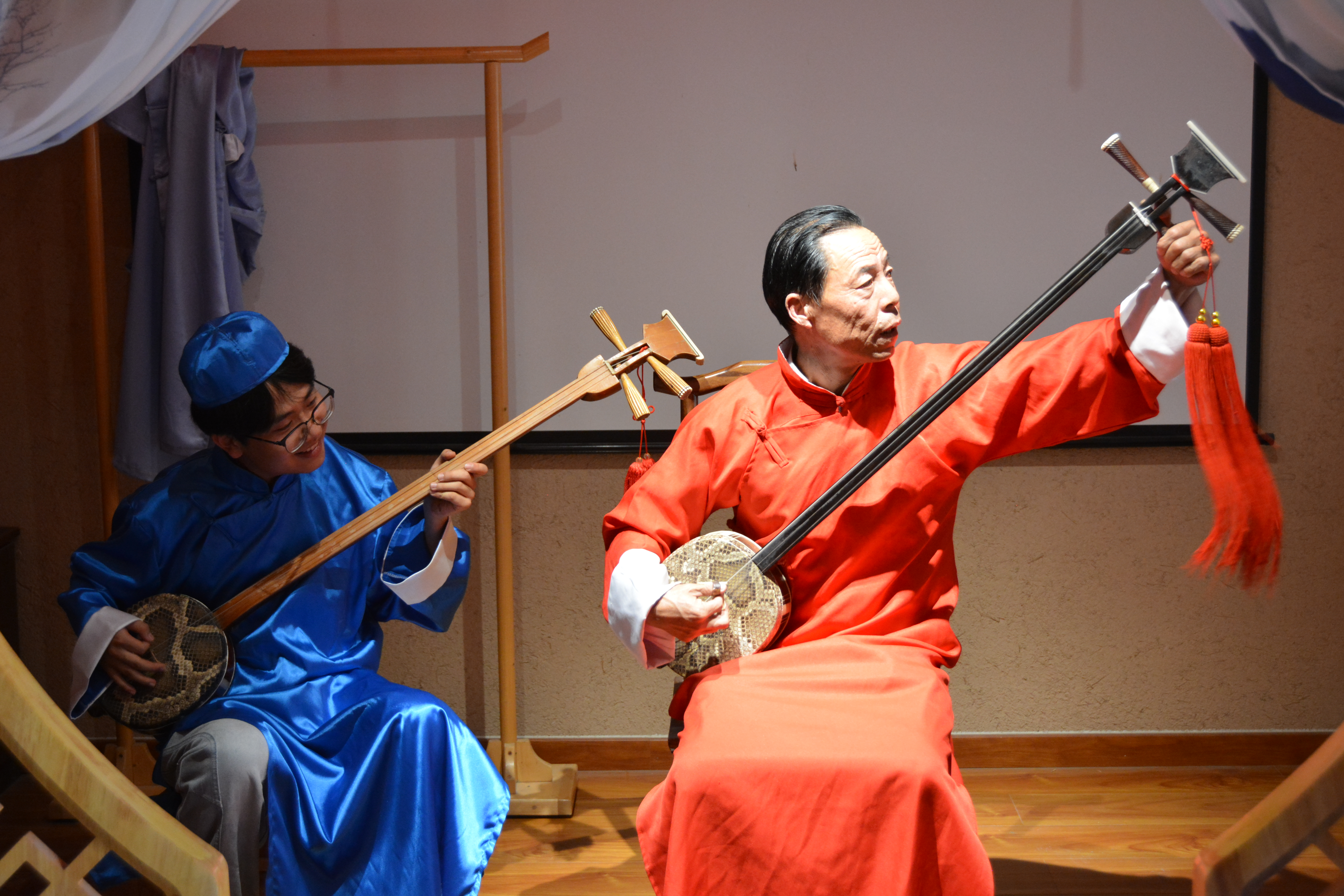 非遺民俗文化館當(dāng)天化身成為一座流動(dòng)的非遺課堂,實(shí)踐團(tuán)成員們圍坐在古樸的庭院中,聚精會(huì)神地聆聽(tīng)當(dāng)?shù)刭Y深賢孝藝人董永虎老師深情演繹的經(jīng)典曲目。老藝人蒼勁而富有穿透力的嗓音,伴著三弦琴弦的顫動(dòng),將一段段蘊(yùn)含忠孝節(jié)義、勸人向善的古老故事娓娓道來(lái)。那飽經(jīng)歲月洗禮的曲調(diào),仿佛穿越時(shí)空,在青磚黛瓦間回蕩,讓在場(chǎng)的每一位學(xué)子都深深沉浸其中,體味著這門古老說(shuō)唱藝術(shù)所承載的歷史重量與人文溫度。