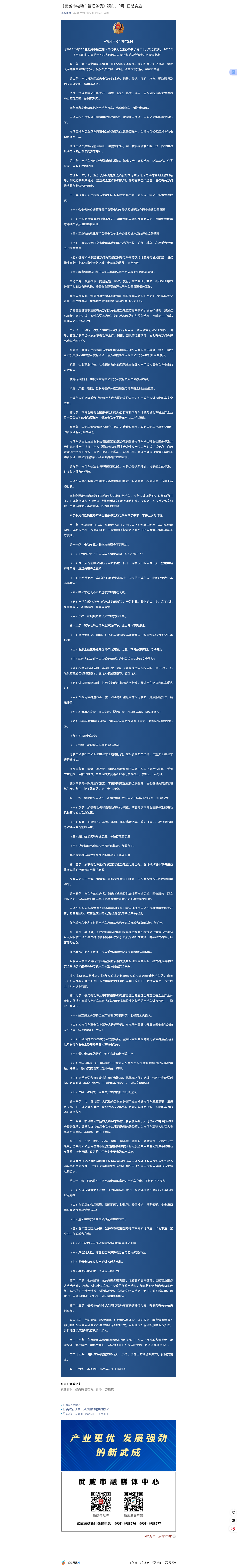 《武威市電動車管理條例》頒布,9月1日起實施!
