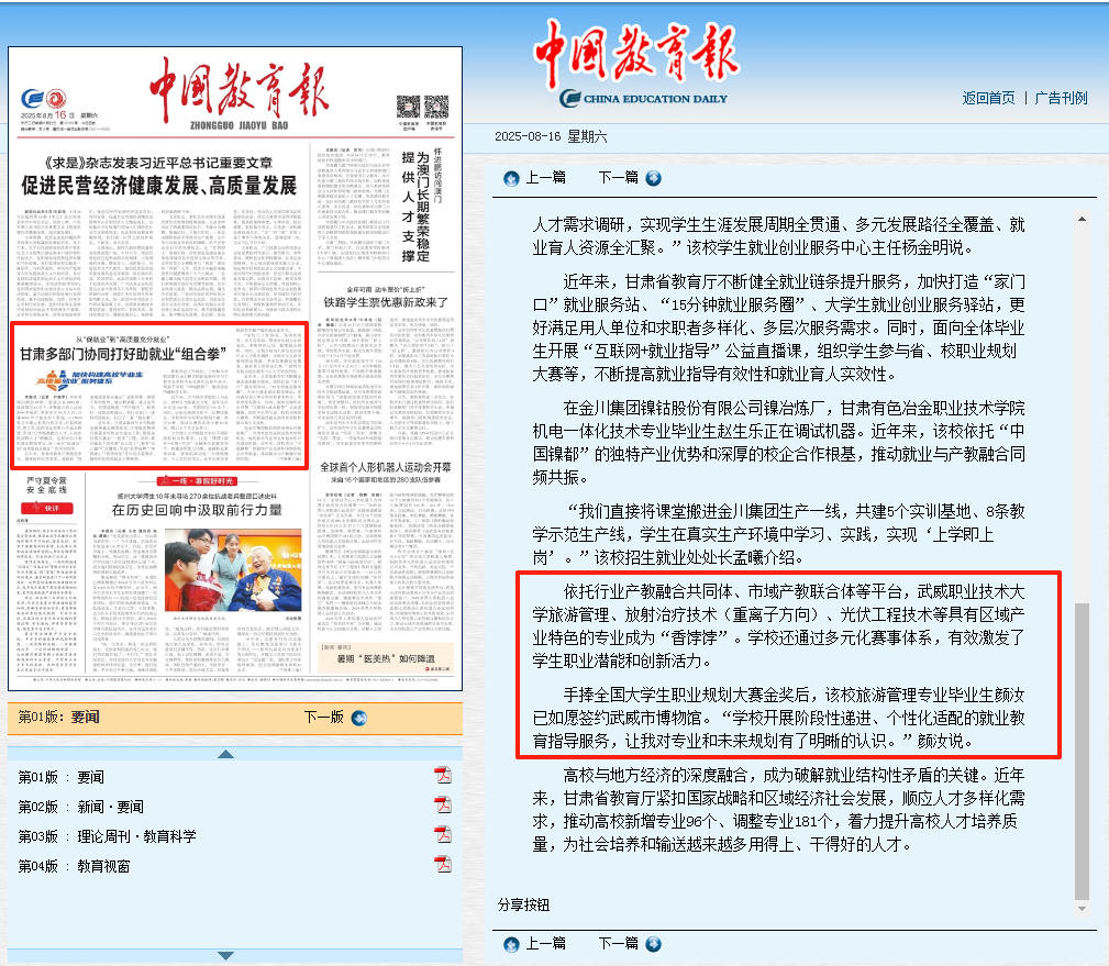 8月16日,《中國教育報》要聞版刊發(fā)“從‘促就業(yè)’到‘高質量充分就業(yè)’甘肅多部門協(xié)同打好助就業(yè)‘組合拳’”的專題報道,報道了我校深化產教融合,賦能高質量充分就業(yè)的創(chuàng)新實踐案例。