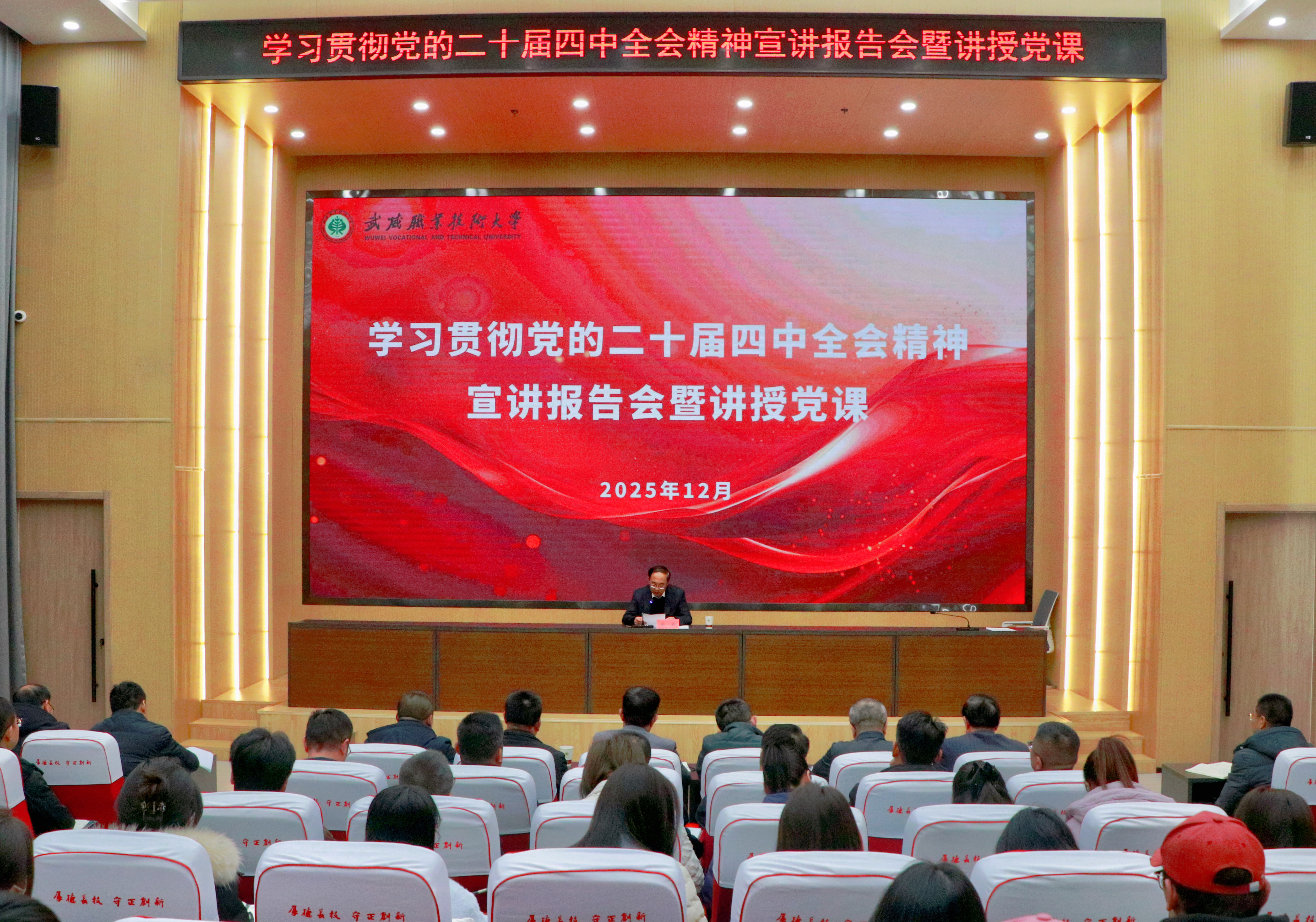 12月10日,黨委書記王宏專題宣講黨的二十屆四中全會精神,并向師生講授黨課。他強調,要深入學習貫徹黨的二十屆四中全會精神,全面把握核心要義,奮力譜寫學校高質量發(fā)展新篇章,為加快推進中國式現(xiàn)代化武威實踐貢獻智慧力量。黨委副書記、副校長張開禮主持報告會。