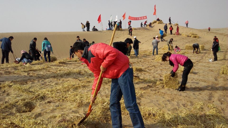 早上9點(diǎn),志愿者們?cè)谖渫星嗄曛驹刚邊f(xié)會(huì)的帶領(lǐng)下參觀了民勤防沙治沙展覽館,了解了勤勞的民勤人民在防沙治沙的歷程中付出的艱辛和取得的成果。隨后,志愿者們到達(dá)了民勤縣薛百鄉(xiāng)黃篙井的壓沙現(xiàn)場(chǎng),按照劃分好的區(qū)域,在專業(yè)技術(shù)人員指導(dǎo)下,志愿者們鋪草壓沙,勞動(dòng)場(chǎng)面分工明確,井然有序。經(jīng)過(guò)一天的辛勤勞動(dòng),50余畝沙丘變成了棋格般整齊的沙障,堅(jiān)實(shí)的沙障阻止了沙丘的移動(dòng),為明春造林活動(dòng)打好了基礎(chǔ)。