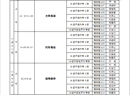 汽車工程系2016-2017學年第一學期期末考試監(jiān)考安排