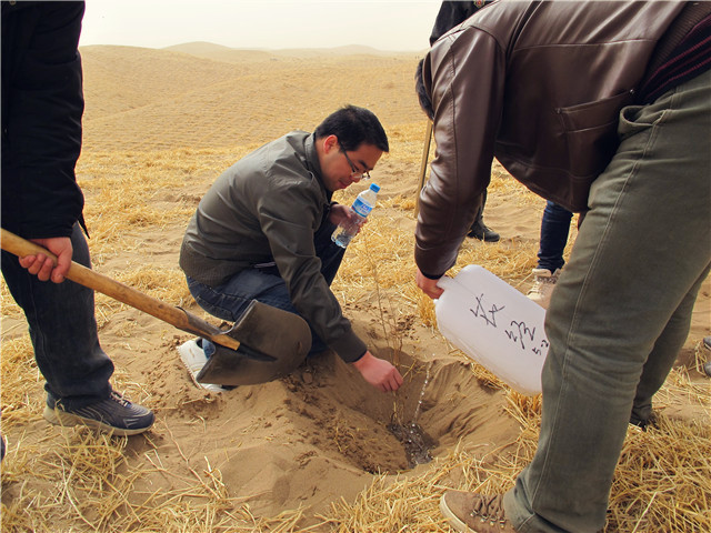 到達(dá)治沙造林現(xiàn)場后,師生按照劃分好的區(qū)域,帶上塑料桶,拿上土鉆,馬上投入到了緊張的勞動(dòng)中。在現(xiàn)場技術(shù)人員的指導(dǎo)下挖坑、栽種樹苗、澆水,完成了預(yù)定的治沙造林任務(wù)。