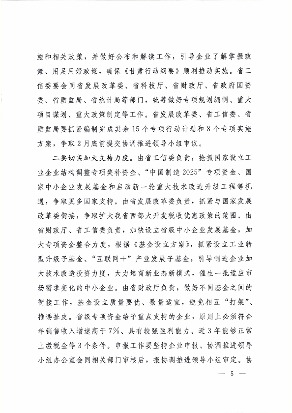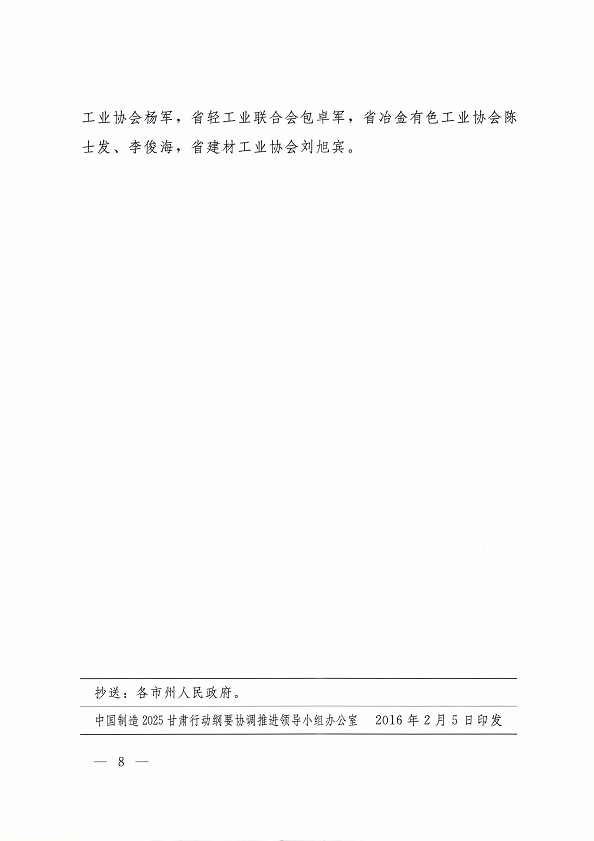 2016 年 1 月 30 日,省委副書記、省長、中國制造 2025甘肅行動綱要協(xié)調(diào)推進(jìn)領(lǐng)導(dǎo)小組組長劉偉平主持召開了協(xié)調(diào)推進(jìn)領(lǐng)導(dǎo)小組第一次會議,研究部署我省行動綱要的協(xié)調(diào)和推進(jìn)工作。現(xiàn)將《中國制造 2025 甘肅行動綱要協(xié)調(diào)推進(jìn)領(lǐng)導(dǎo)小組第一次會議紀(jì)要》轉(zhuǎn)發(fā)你們。