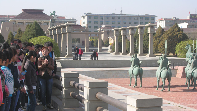 同學(xué)們在講解員的帶領(lǐng)下,首先從漢風(fēng)格大門"中華第一門"開始、參觀了天下第一馬"馬踏飛燕"、凝聚漢文化精粹的巨型浮雕、牌樓、圖騰柱以及堪稱"世界之最"的整體放大6倍的99件銅車馬儀仗俑隊(duì)列,最后參觀了雷臺(tái)漢文化陳列館.