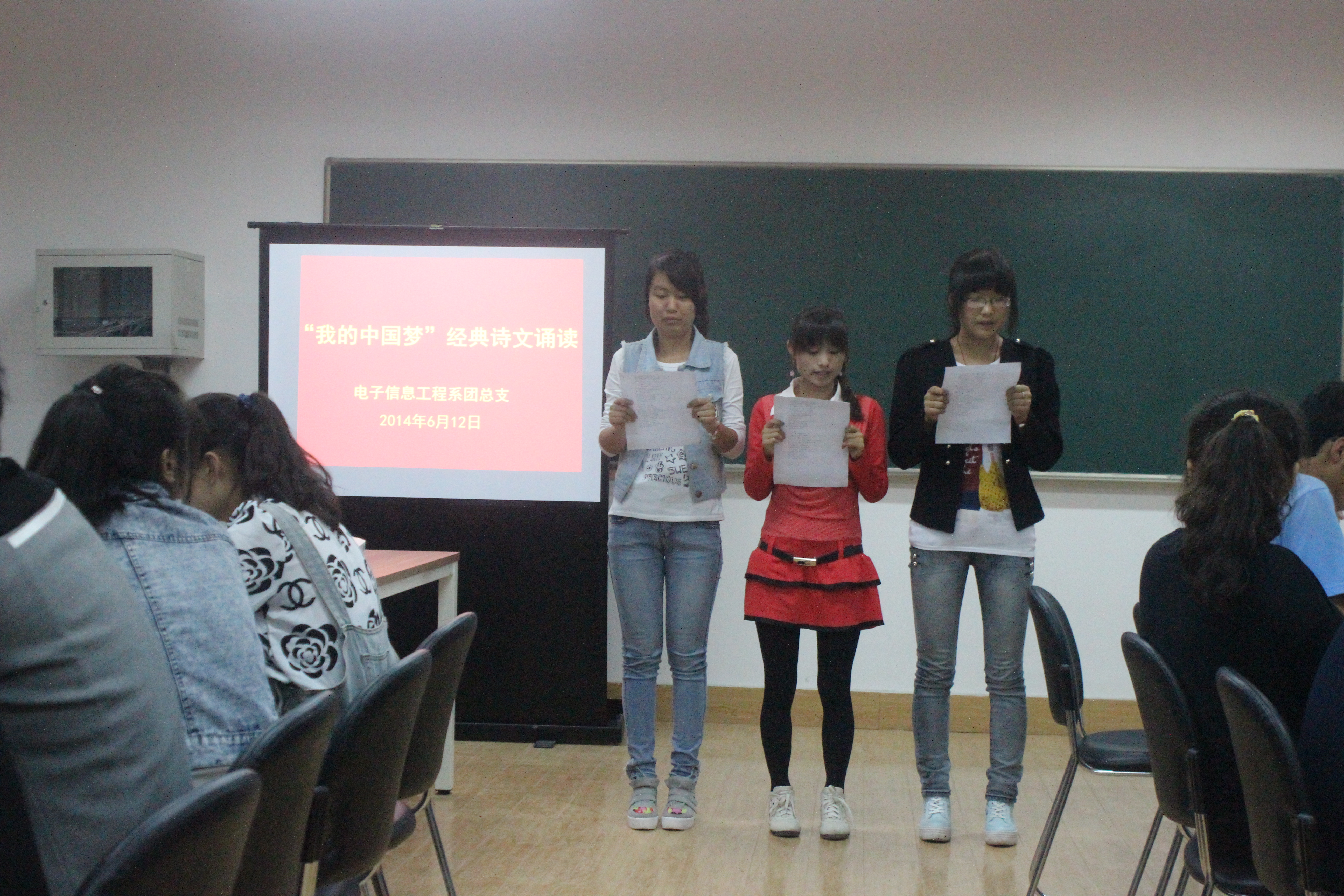 為進(jìn)一步培育和弘揚社會主義核心價值觀,讓學(xué)生在經(jīng)典誦讀中觸摸中國傳統(tǒng)文化,增強(qiáng)愛國主義情懷,提升學(xué)生的文化底蘊和人文素養(yǎng),深入開展中國特色社會主義宣傳教育,教育和引導(dǎo)大學(xué)生樹立正確的理想信念,努力為實現(xiàn)國家富強(qiáng)、民族復(fù)興、人民幸福的偉大“中國夢”而努力。電子信息工程系團(tuán)總支于6月12日晚在MIDP移動互聯(lián)網(wǎng)學(xué)院教研室舉辦“我的中國夢”經(jīng)典愛國詩文誦讀活動。