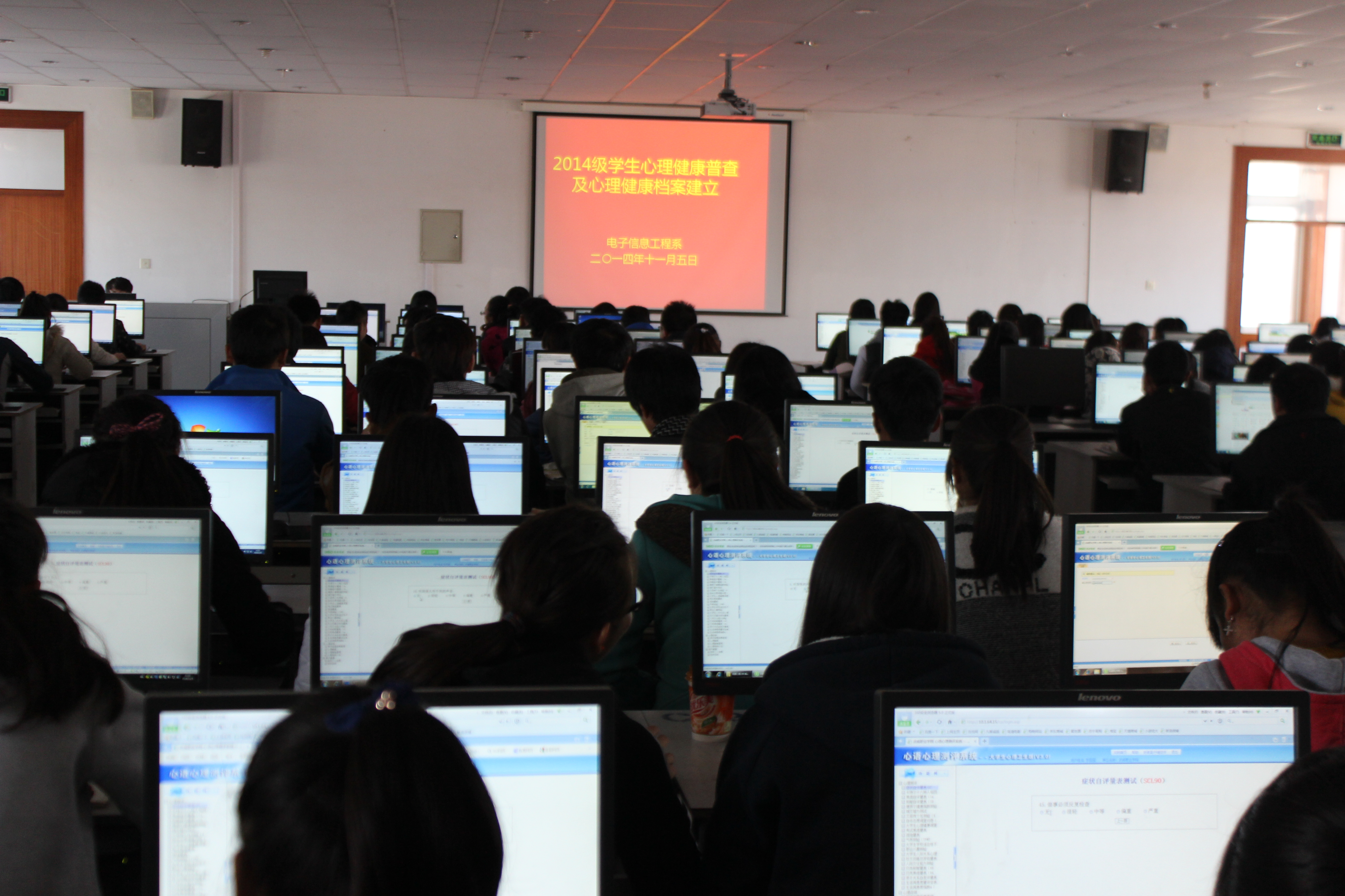 為及時(shí)掌握2014級(jí)學(xué)生的心理健康狀況,有針對(duì)性地進(jìn)行心理健康教育,按照學(xué)院心理健康普查安排及要求,11月5日12時(shí)10分,我系組織2014級(jí)學(xué)生完成了心理健康狀況普測(cè)工作,并為每個(gè)同學(xué)建立了心理健康檔案。