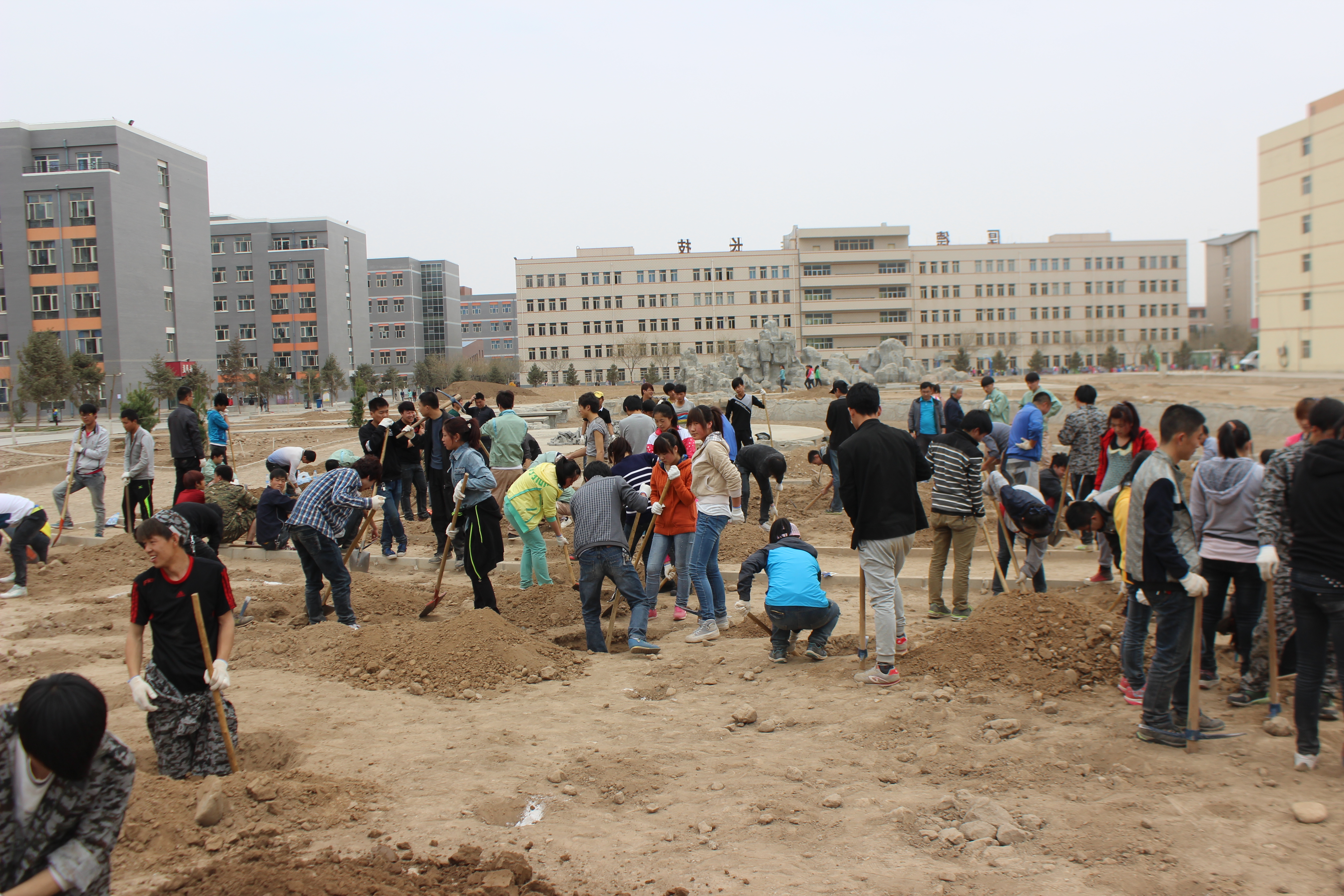 在植樹現(xiàn)場,220名師生積極投入到植樹活動中。他們用镢頭、鐵锨挖開樹坑,放入樹苗,然后細心地往坑中填土;樹苗栽好后認真地扶正樹苗、踩實新土,整個植樹現(xiàn)場一片忙碌。經過全系師生的共同努力,完成了學院一期擴建景觀工程和體育場西側圍墻共200多棵樹苗的栽種任務。