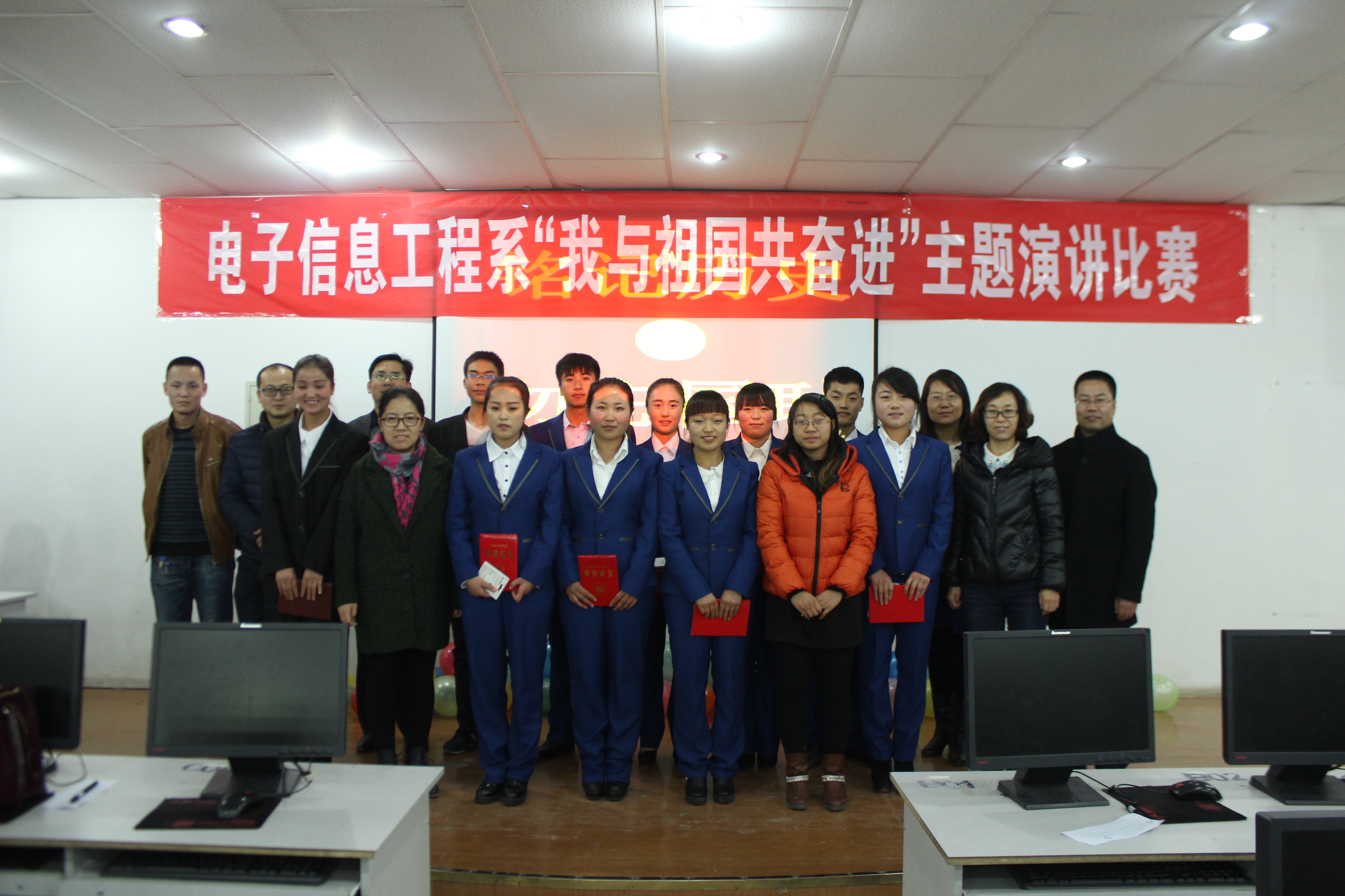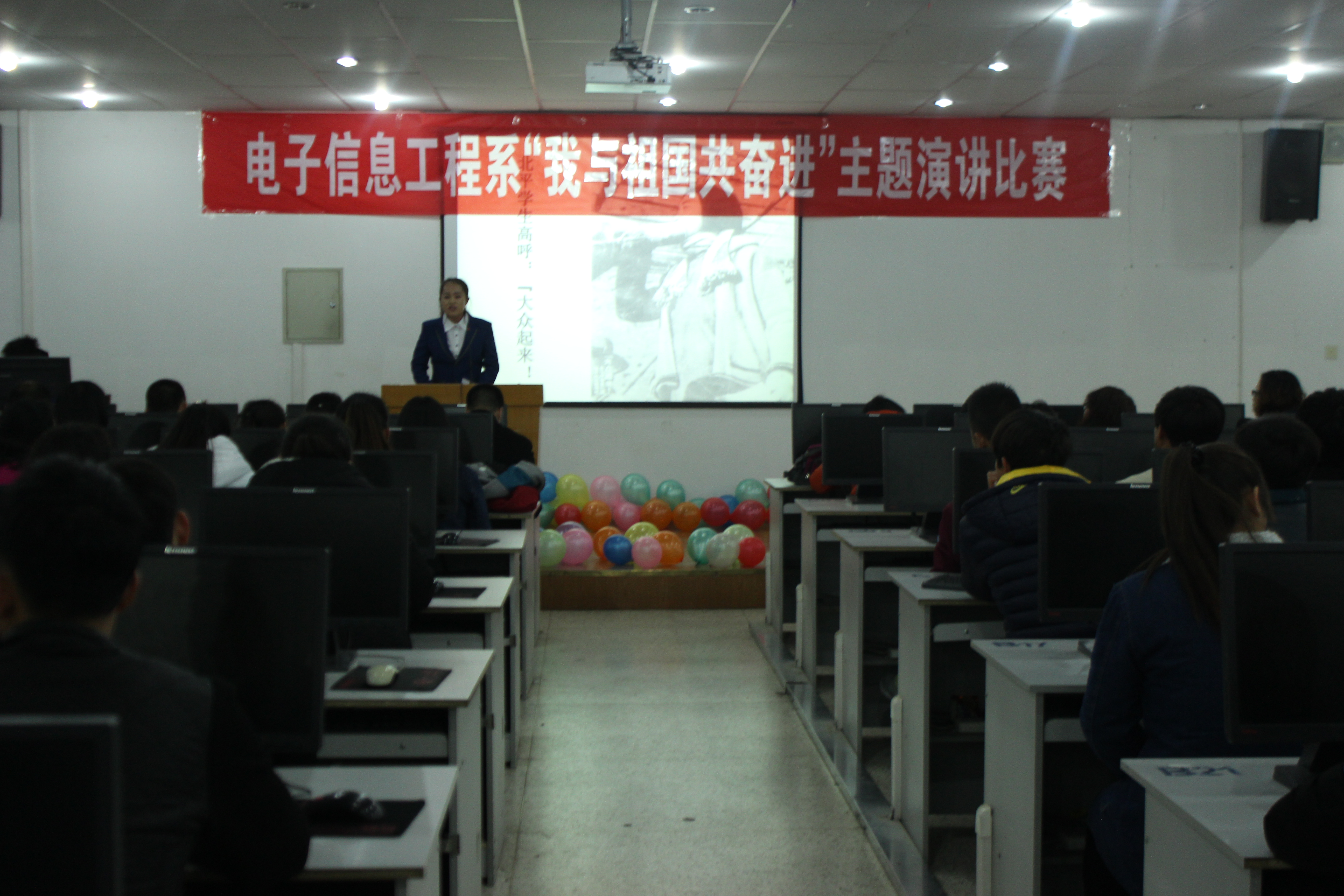 為紀(jì)念“12·9”學(xué)生愛國運(yùn)動(dòng)80周年,激發(fā)我系青年學(xué)生的愛國熱情和報(bào)國之志,進(jìn)一步培育和踐行社會(huì)主義核心價(jià)值觀,提高學(xué)生思想政治素質(zhì),12月6日晚,電子信息工程系在尚德樓11號(hào)機(jī)房舉辦了“我與祖國共奮進(jìn)”主題演講比賽。電子信息工程系黨總支書記張伯成、輔導(dǎo)員鄧偉華、團(tuán)總支書記唐宗舜、全體班主任及系團(tuán)總支180多名團(tuán)員青年觀看了比賽。