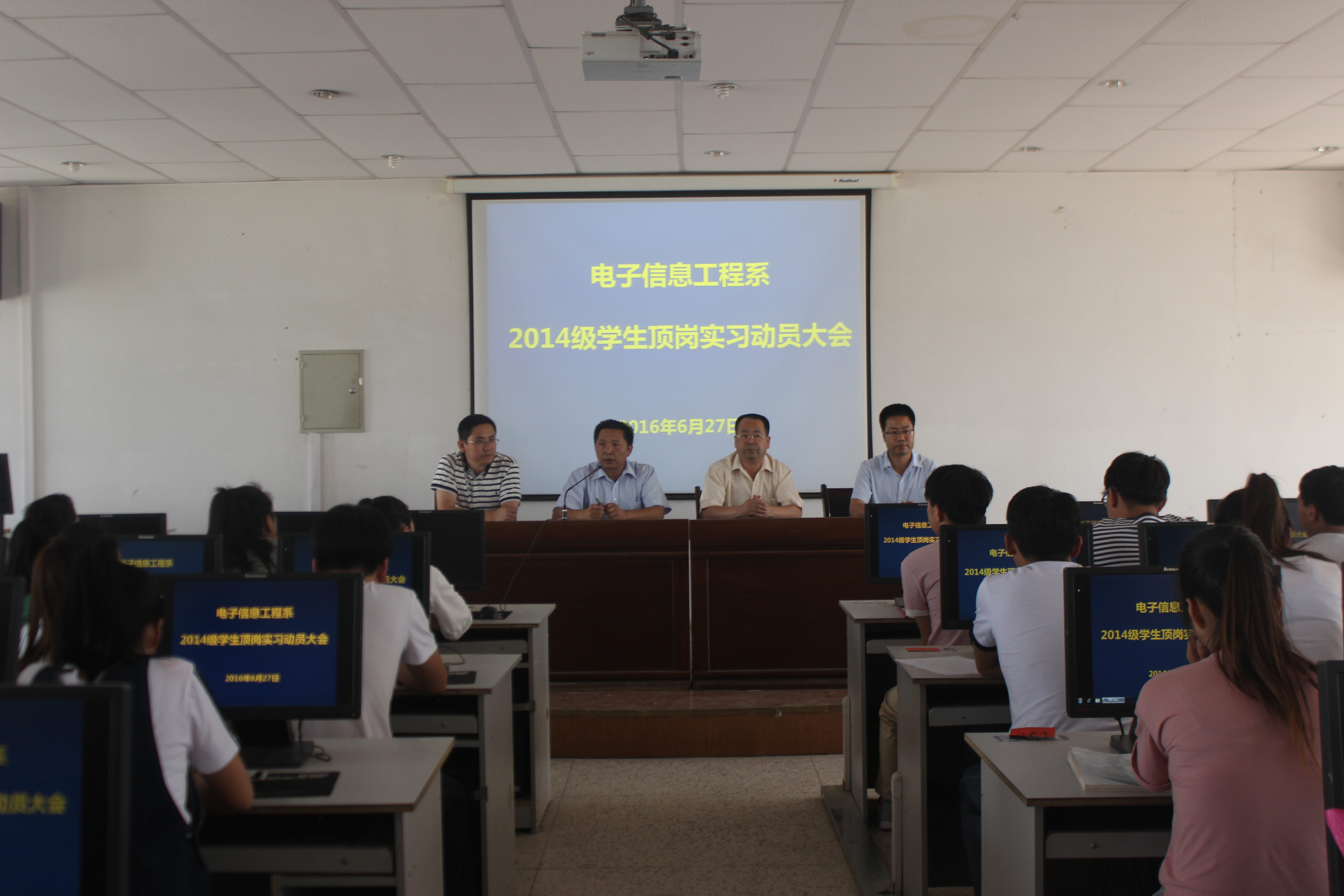 2016年6月27日下午3點(diǎn),電子信息工程系2014級學(xué)生頂崗實(shí)習(xí)動(dòng)員大會在尚德樓十一號機(jī)房舉行。系黨總支書記袁青年、系主任白玉珍、副書記張伯成,班主任鄧偉華、唐宗舜、孫麗山、陳平及2014級全體學(xué)生參加頂崗實(shí)習(xí)動(dòng)員大會。