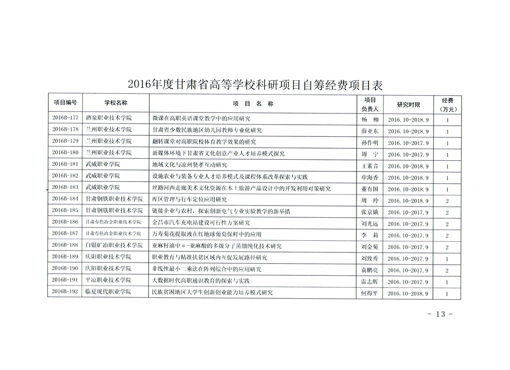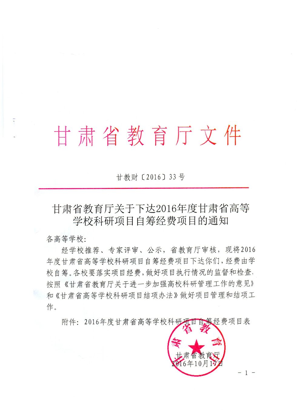 甘肅省教育廳關(guān)于下達2016年度甘肅省高等學(xué)??蒲许椖孔曰I經(jīng)費項目的通知