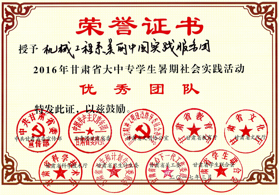 甘肅省大中專學(xué)生暑期社會(huì)實(shí)踐活動(dòng)優(yōu)秀團(tuán)隊(duì)---機(jī)械制造系美麗中國實(shí)踐服務(wù)團(tuán)