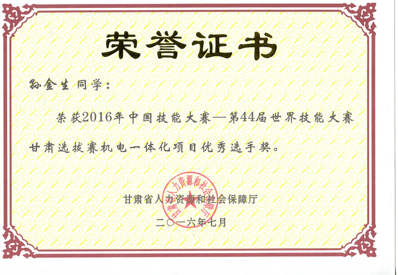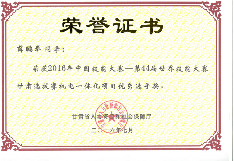 2016年中國技能大賽甘肅選拔賽機(jī)電一體化技術(shù)項(xiàng)目?jī)?yōu)秀獎(jiǎng)