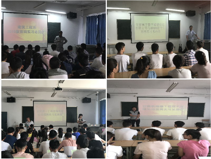 6月8日至6月16日,甘肅寰宇數(shù)字遙感信息有限公司、甘肅新一工程咨詢有限公司、國誠集團(tuán)、蘭州凱瑞德工程有限公司、武威盛大集團(tuán)等實習(xí)接收單位,派專人來校,舉辦企業(yè)宣講會,詳細(xì)地介紹了用人單位的管理制度、日常生活、工作崗位、薪酬待遇等,并與系上洽談了學(xué)生頂崗實習(xí)合作辦法、責(zé)任義務(wù)、安全保障、就業(yè)等涉及學(xué)生諸方面的合作細(xì)節(jié)。
