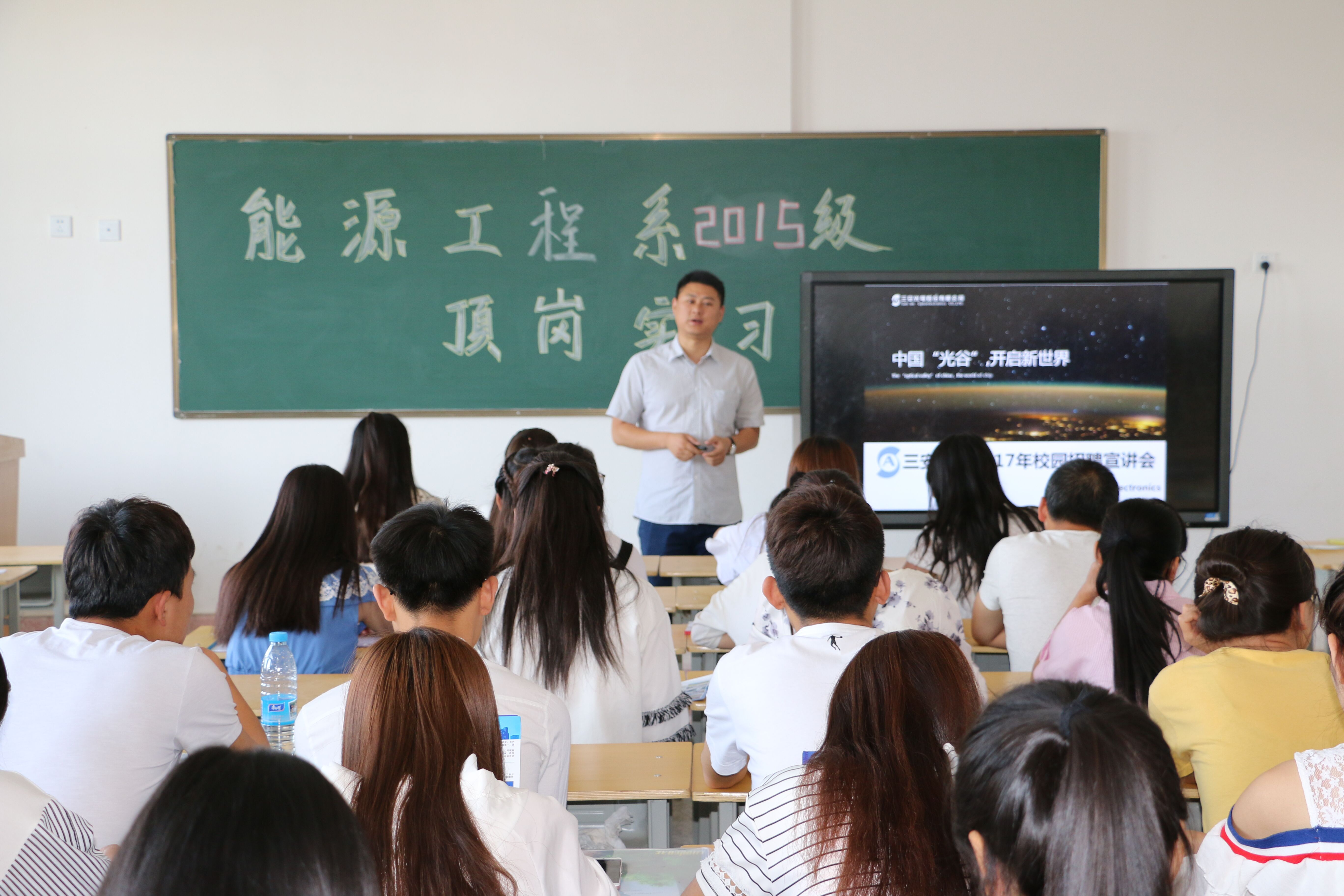 安徽三安光電有限公司在行樹樓504教室開展了頂崗實習宣講會,2015級農村能源與環(huán)境技術大專班和2015級太陽能光熱技術及應用大專班學生參加了此次宣講會。李明經理就企業(yè)概況、企業(yè)文化、崗位需求、薪酬待遇等方面向同學們做了介紹,并對有應聘意向的同學進行了面試,最終共有50人被安徽三安光電有限公司錄用。