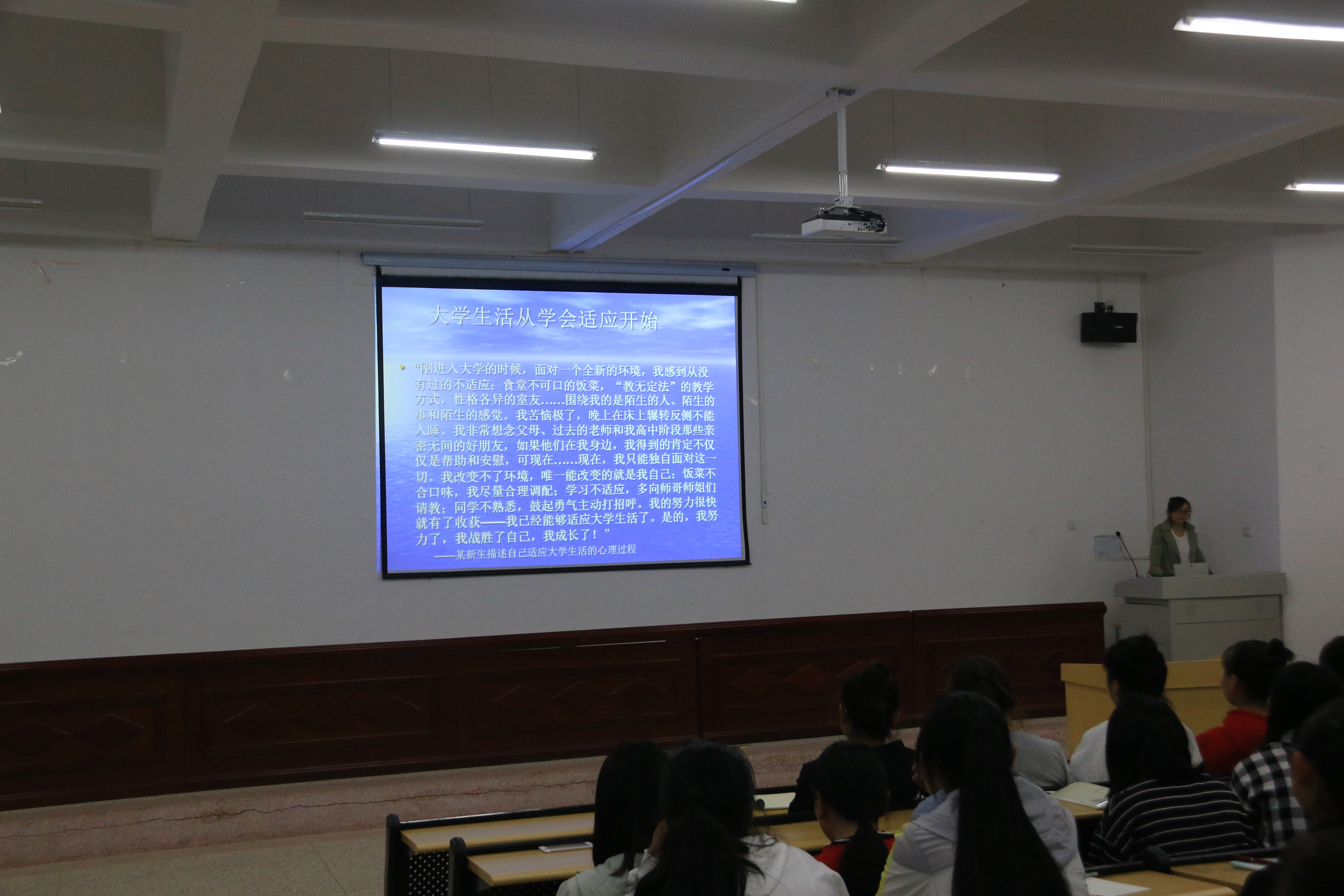 劉菊蓮老師主要針對(duì)大一新生面對(duì)新的環(huán)境、新的學(xué)習(xí)狀況及新的人際變化這三方面新生適應(yīng)問題的表現(xiàn)談了具體的解決方法,面對(duì)新生活出現(xiàn)的心理困惑,通過豐富的案例、簡單易懂的道理、風(fēng)趣幽默的講解,讓晦澀的理論變得淺顯易懂,為我院大學(xué)生帶來一次心理的洗禮。