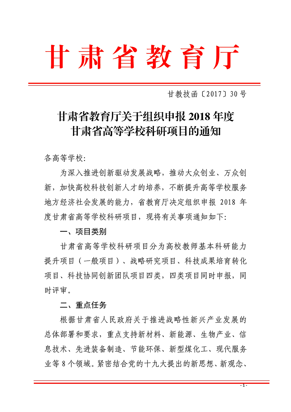甘肅省教育廳關(guān)于申報(bào)2017年度甘肅省高等學(xué)校科…