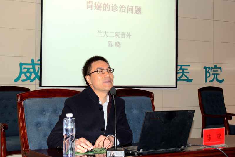 醫(yī)院邀請到蘭州大學(xué)第二醫(yī)院普外三科主任、胃腸外科主任、主任醫(yī)師陳曉和普外二科副主任,副主任醫(yī)師康博雄為大家作學(xué)術(shù)講座。陳曉主講了《胃癌的診治問題》,并與大家分享了他在法國醫(yī)院和美國醫(yī)院進(jìn)修學(xué)習(xí)時(shí)的一些感想和見聞。陳曉在講座中結(jié)合臨床體會(huì)說:許多胃癌患者在就診時(shí)已經(jīng)發(fā)展為中晚期,失去了手術(shù)機(jī)會(huì)。他呼吁全社會(huì)要認(rèn)識(shí)到對胃癌高發(fā)地區(qū)、高危年齡、高危人群進(jìn)行篩查的必要性。醫(yī)生要對有癥狀的患者及早進(jìn)行胃鏡檢查,爭取做到早發(fā)現(xiàn)、早診斷、早治療。講座中,陳曉就外科手術(shù)吻合方式選擇與直屬附屬醫(yī)院外科主任滕志勇醫(yī)生進(jìn)行了現(xiàn)場互動(dòng)。