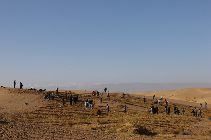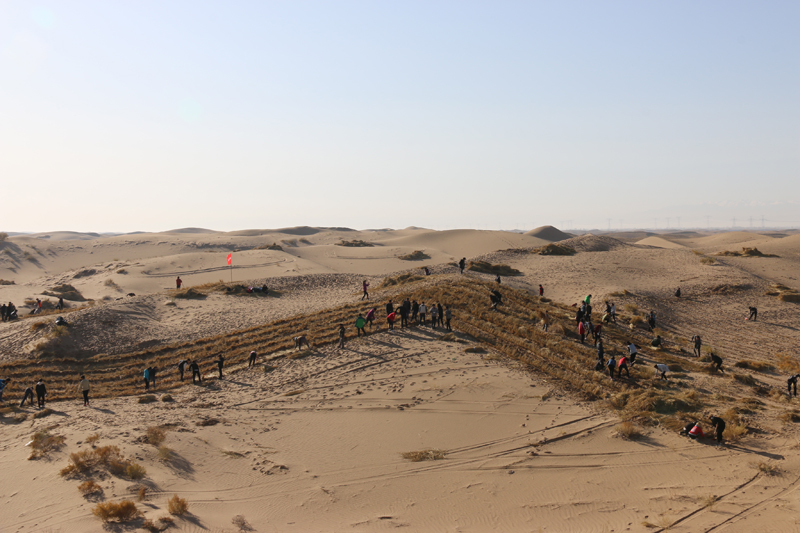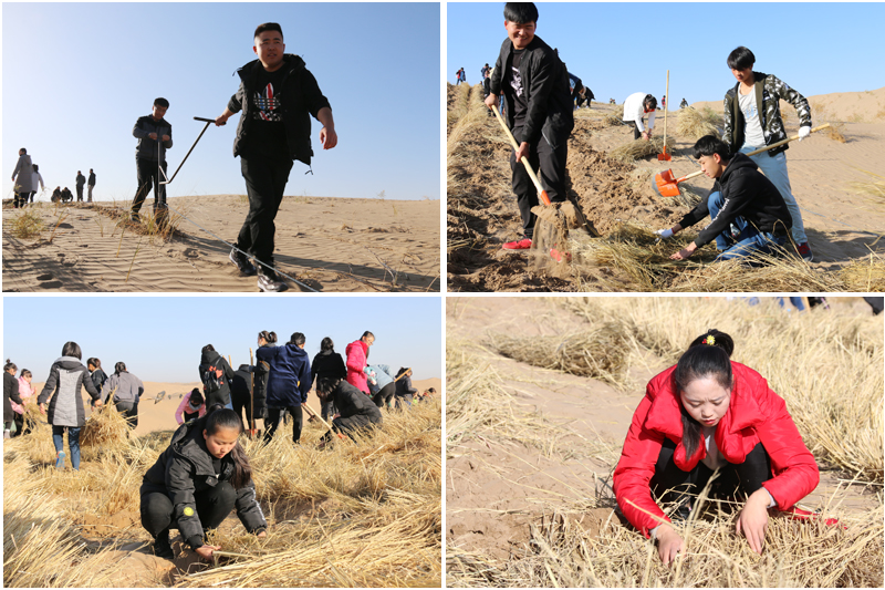 在勞動(dòng)現(xiàn)場,學(xué)院領(lǐng)導(dǎo)和師生們不畏冬寒,分工協(xié)作,按照標(biāo)準(zhǔn)和要求劃線開溝、蒲草培沙、等距離推進(jìn),現(xiàn)場一片熱火朝天的景象。荒蕪的沙地身披新衣,整齊的稻草方格逐漸向遠(yuǎn)處的沙丘覆蓋。